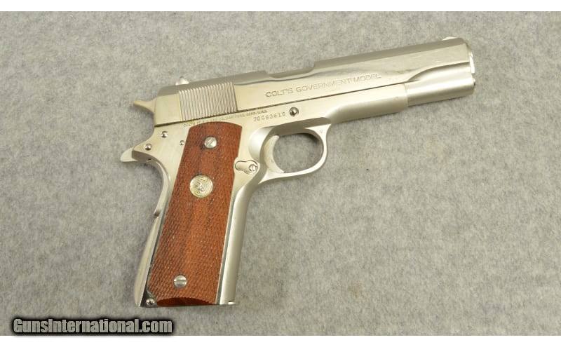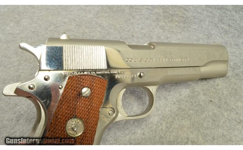 Description: For your consideration, the Colt Govt Model MK IV Series 70 semi-auto pistol chambered in .45 Auto. Features a nickel finish and checkered wood grips with medallions. This model is a 70G prefix (1976-80) manufactured in 1976. .45 Auto SOLD Metal Condition: Very Good Wood Condition: Very Good Bore Condition: Very Good Barrels: 5 in Weight: 2.5lbs Item Location: Centerville, OH |
