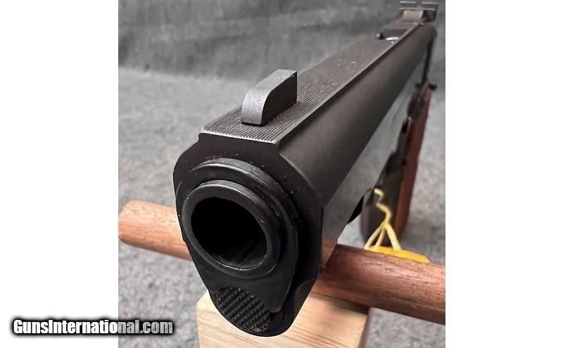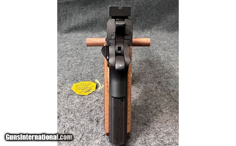 Description: This new, unfired in-the-box condition semi-automatic pistol is a Colt MK IV/Series 70 Gold Cup National Match chambered in .45 Auto. It has a fixed front sight, an Elliason adjustable rear sight, serrated adjustable trigger, serrated backstrap and foregrip, Colt Gold medallion wood grips, and left side thumb safety. It comes with matching numbered box, including Colt welcome letter, Instruction manual, Repair Stations insert, NRA Postcard, the Colt Companion insert, plastic bag with oil paper, tools and tool envelope, and styrofoam. .45 Auto SOLD Metal Condition: "New unfired, in the box condition Wood Condition: "New unfired, in the box condition Bore Condition: "New unfired, in the box condition Barrels: 5 Inch barrel Triggers: Serrated adjustable trigger Stock Dimensions: Overall length 8½ inches Weight: 2 lb 6 oz Sights: "Fixed front sight, Elliason adjustable rear sight Item Location: Wichita, KS |