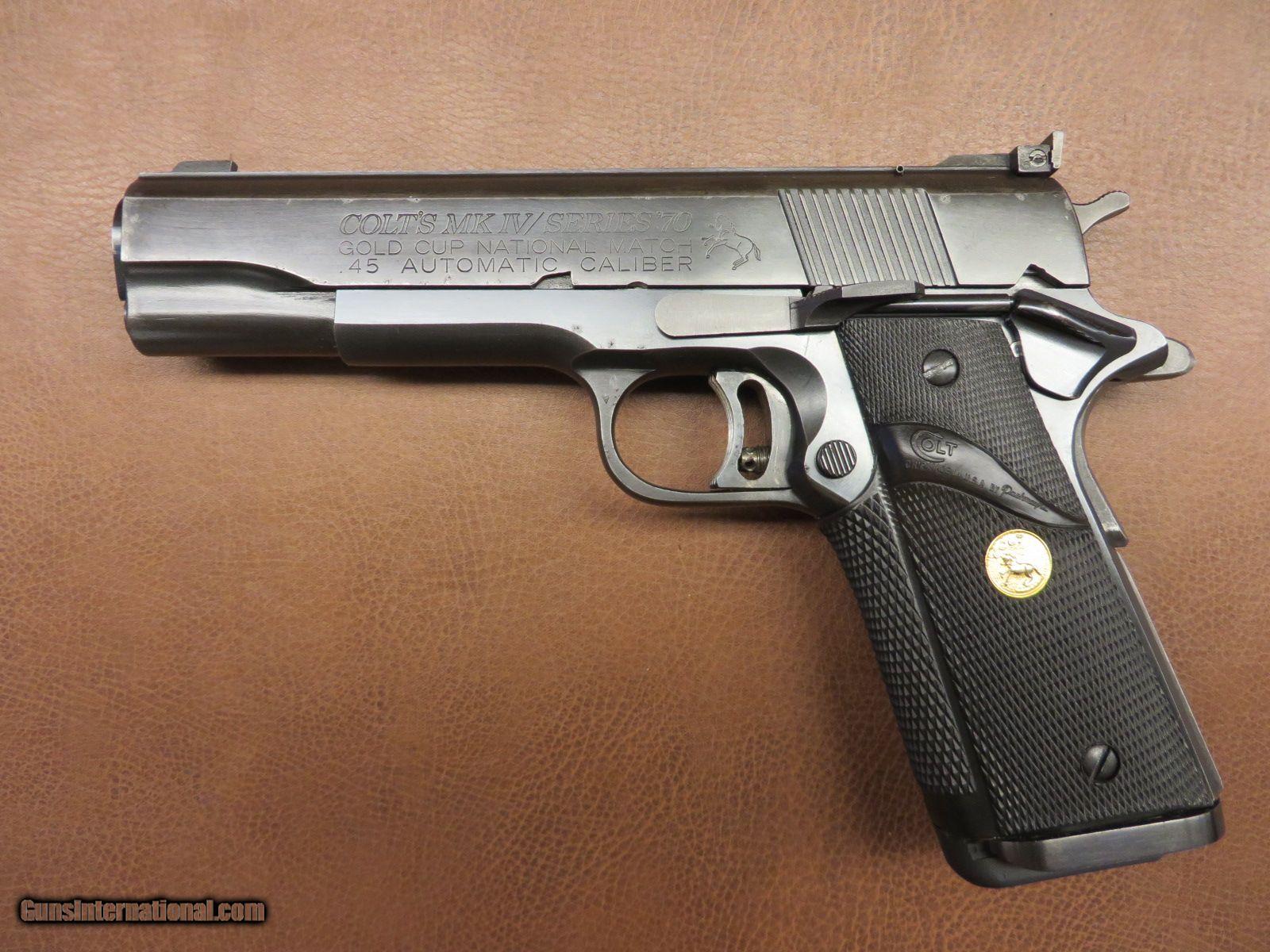 Description: .45 A.C.P. has 5 inch barrel with original Elliason adjustable sights. Serial number 70N32xxx. Pachmayr rubber grips with gold Colt medallions. Extended slide release. Flared magazine well. Stainless steel 8 round magazine with rubber er. 80-85% blue. SOLD |