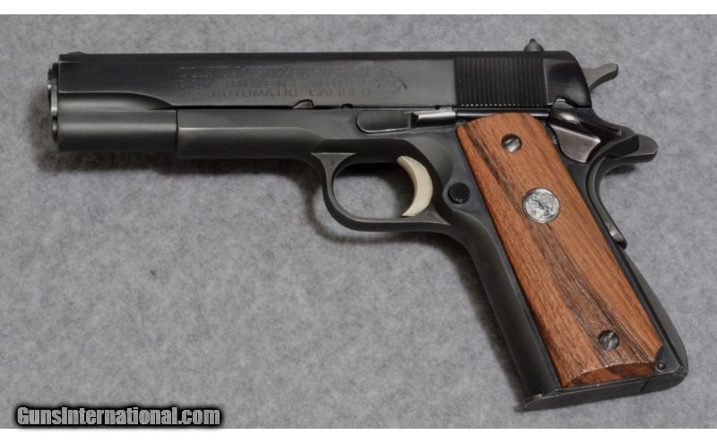 Description: From 1911 until 1970 there were virtually no significant changes to the basic design, but the year 1971 saw the first mechanical "improvement" to the 1911-type pistol. Colt redesigned the barrel bushing from a solid cylindrical type to a spring-steel, "finger collet" bushing that gripped the end of the barrel, which had also been slightly redesigned with a slight belled end to accommodate the collet bushing. The new "Accurizor" barrel and bushing was intended to improve the intrinsic accuracy of the new Colt Government Model pistols, which were then designated the MK IV/Series 70 to differentiate them from all prior variations of the Government Model. This gun comes with the .22 Long Rifle conversion kit. SOLD Caliber Info: .45 Auto Metal Condition: Excellent Wood Condition: Excellent Bore Condition: Excellent Barrels: 5 Stock: Upgraded Colt Grips Weight: 40 ozs. Sights: Adjustable Extras: Comes with 2 .45 magazines and a .22 conversion kit and 1 .22 magazine. Item Location: Tulalip, WA |
