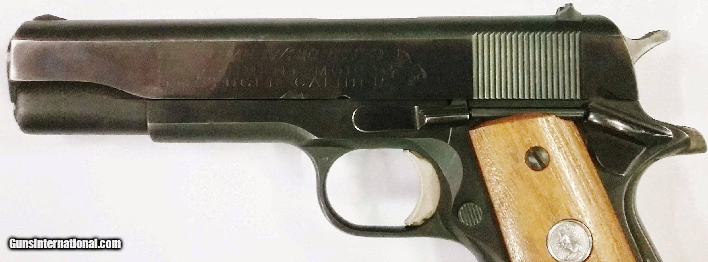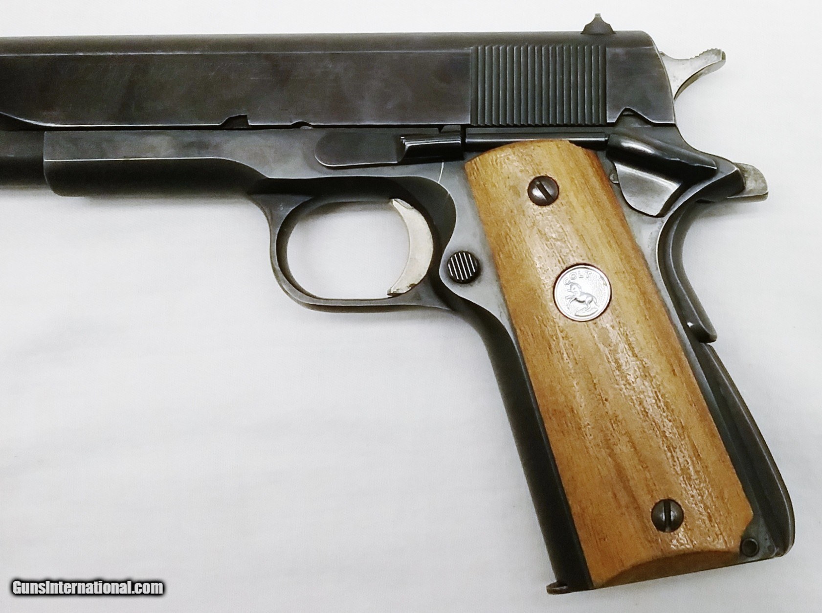Description: This 9mm Colt MK IV Series 70 Government Model has a 5” blued barrel with a slide mounted with fixed open sights. The bore is very good. The Walnut grips bearing the Colt insignia on both sides are attached to the blued receiver. The right side of the receiver is stamped with Colt’s Government Model, the left with Colt’s MK IV Series 70 Government Model 9mm Luger Caliber. This revolver is in good condition with the exception of minor usage dents and dings. Comes with a 9 round magazine. Overall length is 10”, weight is 2 lbs, 6 oz. Our stock number is A799. Will ship to any FFL anywhere in the United States. Buyer pays freight and insurance. SOLD Manufacturer: Colt Model: MK IV - Series 70 Caliber Info: 9mm Bore: Rifled Condition: Good Metal Condition: Good Wood Condition: Good Bore Condition: Very Good Barrels: One Barrel Type: Round Action: Semi-Automatic Triggers: One Stock: Walnut Finish: Blued Weight: 2 lbs, 6 oz Sights: Fixed |