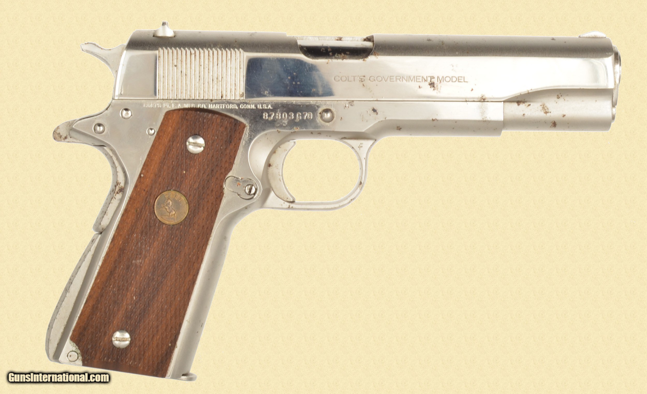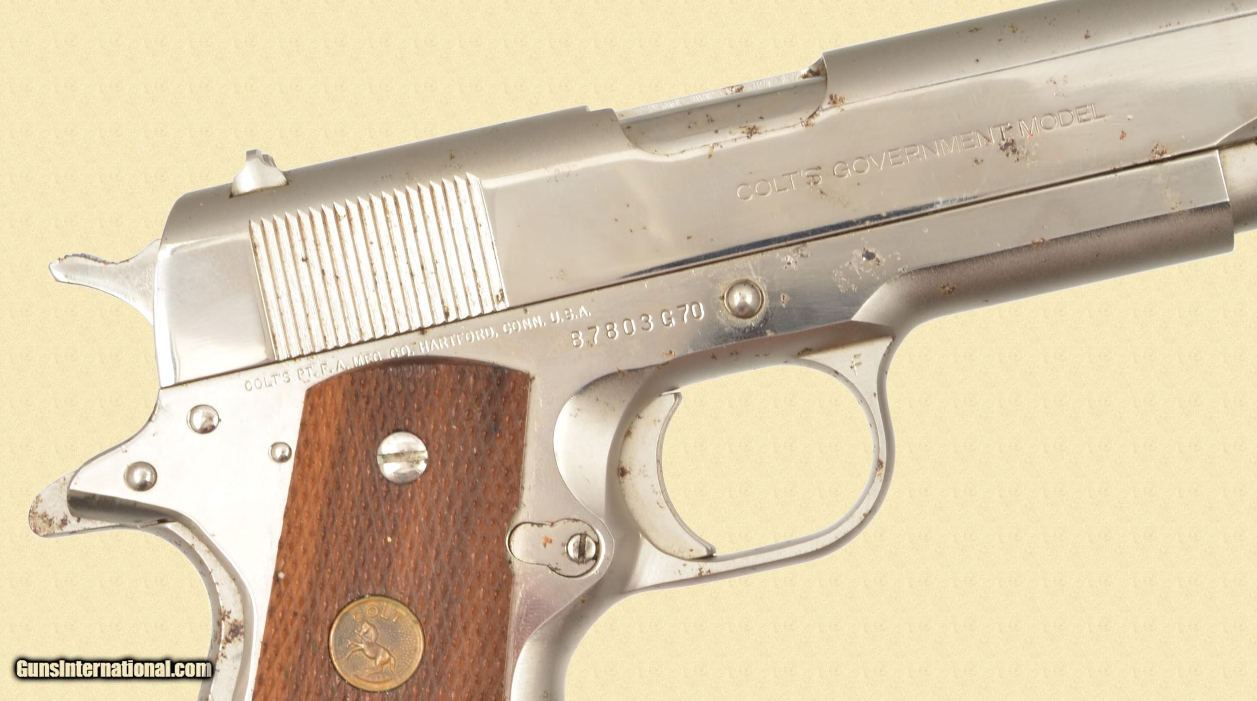 Description: 45 ACP; Very good bore, Very good grips, 5.3'' barrel, Manufactured in 1978. Original nickel plating. The left side of the slide is stamped COLT'S MK IV / SERIES 70 / GOVERNMENT MODEL / 045 AUTOMATIC CALIBER and the right side has COLT'S GOVERNMENT MODEL The right side of the frame is stamped with the one line Colt address and the serial number. The nickel plating has several spots of patina , on the slide and frame. The barrel is marked COLT 45 AUTO / MK IV SERIES 70 The walnut checkered grips are in very good condition. Please call (309)342-5800 Tues-Fri, 10 am -6pm (CST), or Sat 1pm-6pm (CST), to speak with our sales team for further information, or to purchase firearms. FEDERAL FIREARMS LICENSE (FFL): is required on all shipments of modern guns. We must wait for a copy from your dealer before we can ship to them. We will also ship C&R eligible firearms to Curio and Relic (C&R) license holders. We accept your signed, legible FFL and C&R licenses via fax at 309/ 342-5730 (always on), email at FFLsimpsonltd or through the mail at Simpson Ltd; 140 S Seminary St; Galesburg, IL 61401. Pre-1898 firearms and non-firearms items are exempt from licensing requirements. All items shipped to an Illinois address will be charged 8.75% sales tax. NOTE: Because of recent shipping restrictions and charges placed on us by UPS and FedEx (handguns must ship via next day or 2nd day air and they have added a $10 surcharge for parcels over 48”. Our return policy lasts a maximum of 3 days from the time you receive your item. If 3 days have passed since you received your purchase, and we have not been contacted by you, unfortunately, we can’t offer you a refund or exchange. If you are not happy with your purchase, please contact us by phone and/or email to arrange for a return. Items must be shipped back to us to arrive with 7 days of notification of return. SOLD Serial Number: 87803G70 |