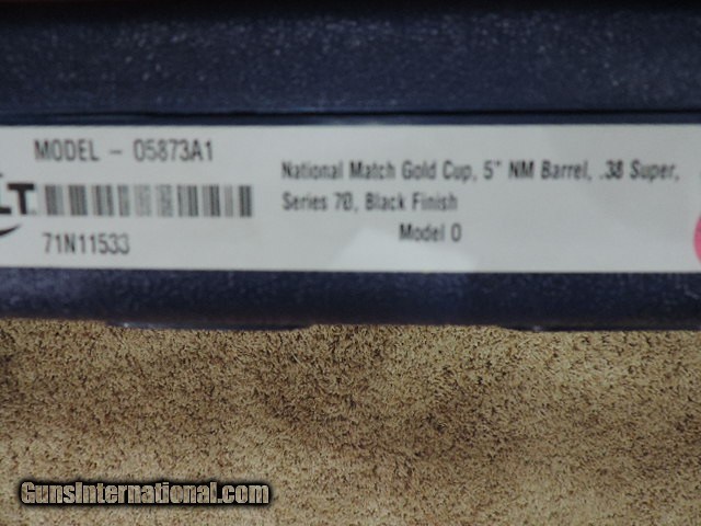 Description: COLT O5873A1 GOLD CUP NATIONAL MATCH SERIES 70 38 SUPER - BLUED FINISH CUSTOM HAND ENGRAVED RECEIVER AND SLIDE. HAND ENGRAVED CHROME AND GOLD METAL GRIPS. WIDE ADJUSTABLE ALUMINUM TRIGGER. ONE 9 ROUND MAG. NEW IN BLUE COLT HARDCASE. SUBJECT TO PRIOR STORE SALE. SHIP TO FFL ONLY. BUYER RESPONSIBLE TO DETERMINE IF FIREARM IS LEGAL IN HIS/HER STATE. BUYER PAYS 3% FOR CREDIT CARD. BUYER PAYS $40.00 SHIPPING TO LOWER 48 STATES. ARIZONA RESIDENTS PAY 6.712% SALES TAX. SOLD Handgun Caliber: .38 Super Auto Manufacturer: COLT Model: O5873A1 Serial Number: 71N11533 Condition: NEW IN BOX |