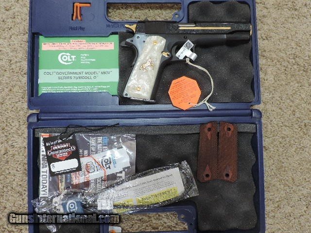 Description: DAVIDSON EXCLUSIVE COLT O1911C-38-DHM HERITAGE GOVERNMENT CLASSIC SEMI AUTO 38 SUPER SINGLE ACTION SERIES 70 PISTOL WITH 5 INCH NATIONAL MATCH BARREL. CUSTOM PEARLITE GRIPS FEATURING GOLD COLT RAMPANT HORSE. ALSO INCLUDES CKECKERED ROSEWOOD GRIPS, ENGRAVED SLIDE WITH GOLD ACCENTS INCLUDING GOLD COLT RAMPANT HORSE. GOLD ACCENTS ON BARREL NUT, TRIGGER, GRIP SCREWS & MAGAZINE RELEASE. ONE 9 ROUND MAG. NEW IN BLUE COLT HARD CASE. SUBJECT TO PRIOR STORE SALE.. SHIP TO FFL ONLY. BUYER RESPONSIBLE TO DETERMINE IF FIREARM IS LEGAL IN HIS/HER STATE. BUYER PAYS 3% FOR CREDIT CARD. BUYER PAYS $40.00 SHIPPING TO LOWER 48 STATES. ARIZONA RESIDENTS PAY 6.712% SALES TAX. SOLD Handgun Caliber: .38 Super Auto Manufacturer: COLT Model: O1911C-38 Serial Number: GV00XXXX Condition: New in Box |