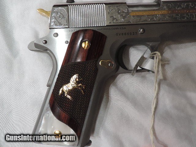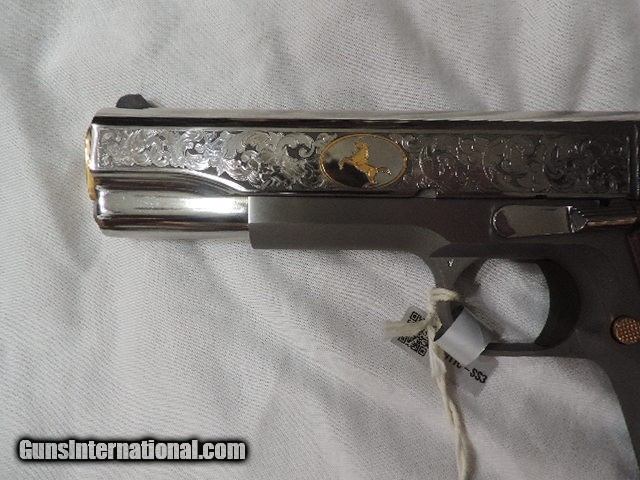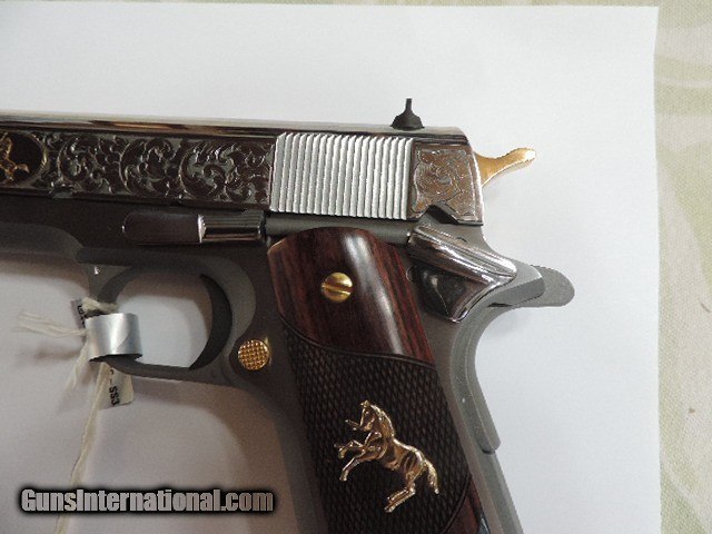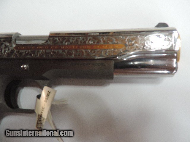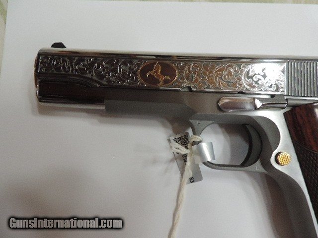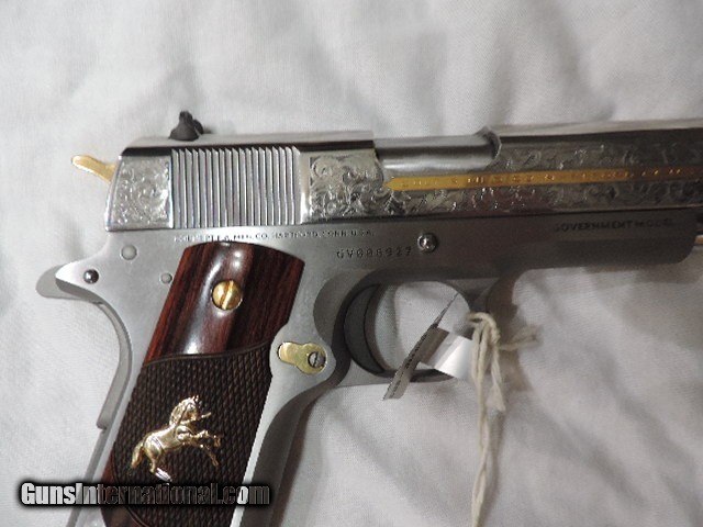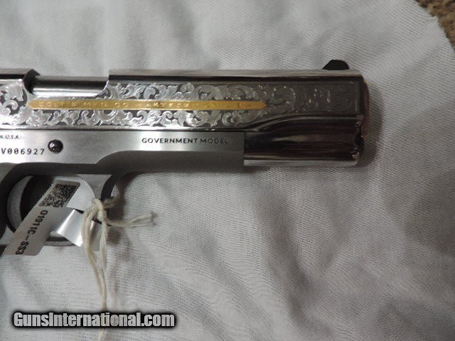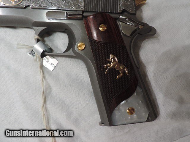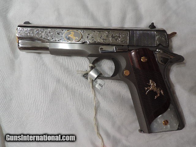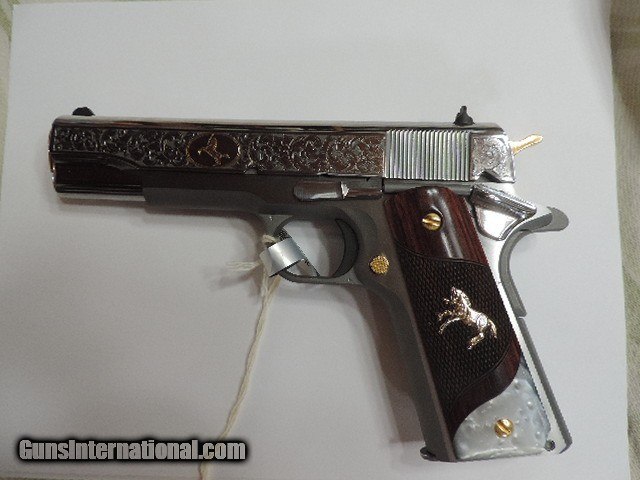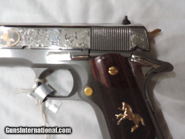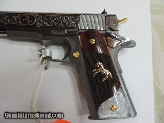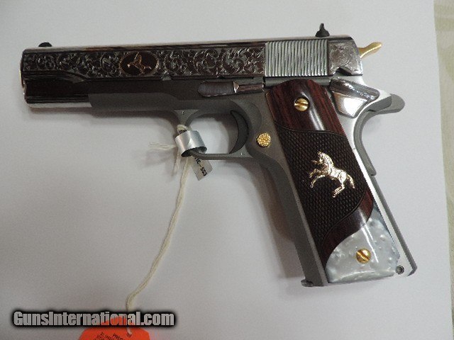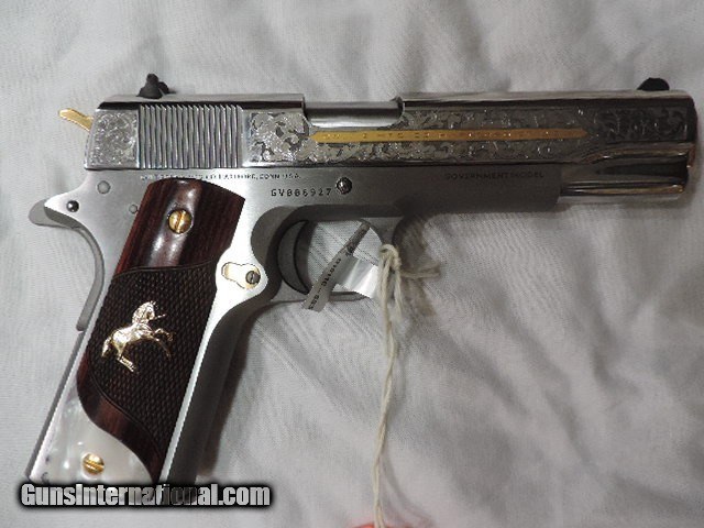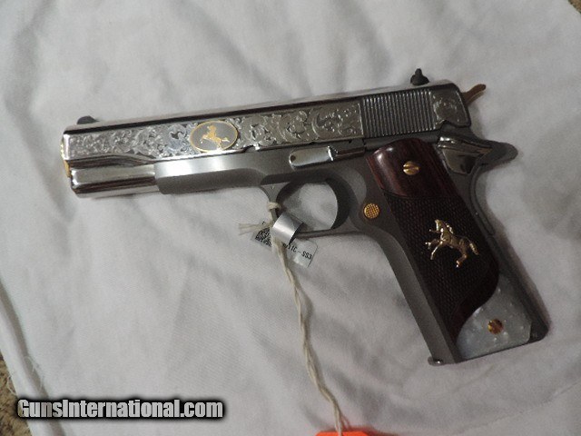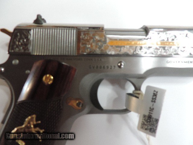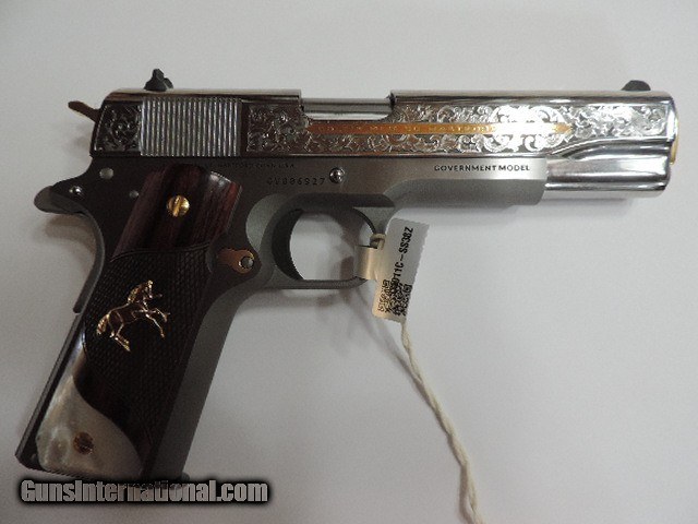 Description: DAVIDSON EXCLUSIVE COLT O1911C-SS38-DHM HERITAGE GOVERNMENT CLASSIC SEMI AUTO 38 SUPER SINGLE ACTION SERIES 70 PISTOL WITH 5 INCH NATIONAL MATCH BARREL. CUSTOM WOOD CHECKERED AND PEARLITE GRIPS FEATURING GOLD COLT RAMPANT HORSE. ALSO INCLUDES CKECKERED ROSEWOOD GRIPS, ENGRAVED SLIDE WITH GOLD ACCENTS INCLUDING GOLD COLT RAMPANT HORSE. GOLD ACCENTS ON BARREL NUT, TRIGGER, GRIP SCREWS & MAGAZINE RELEASE. ONE 9 ROUND MAG. NEW IN BLUE COLT HARD CASE. SUBJECT TO PRIOR STORE SALE.. SHIP TO FFL ONLY. BUYER RESPONSIBLE TO DETERMINE IF FIREARM IS LEGAL IN HIS/HER STATE. BUYER PAYS 3% FOR CREDIT CARD. BUYER PAYS $40.00 SHIPPING TO LOWER 48 STATES. ARIZONA RESIDENTS PAY 6.712% SALES TAX. SOLD Handgun Caliber: .38 Super Auto Manufacturer: COLT Model: O1911C-SS38 Serial Number: GV01XXXX Barrel Length: 5 INCH Condition: New in Box |