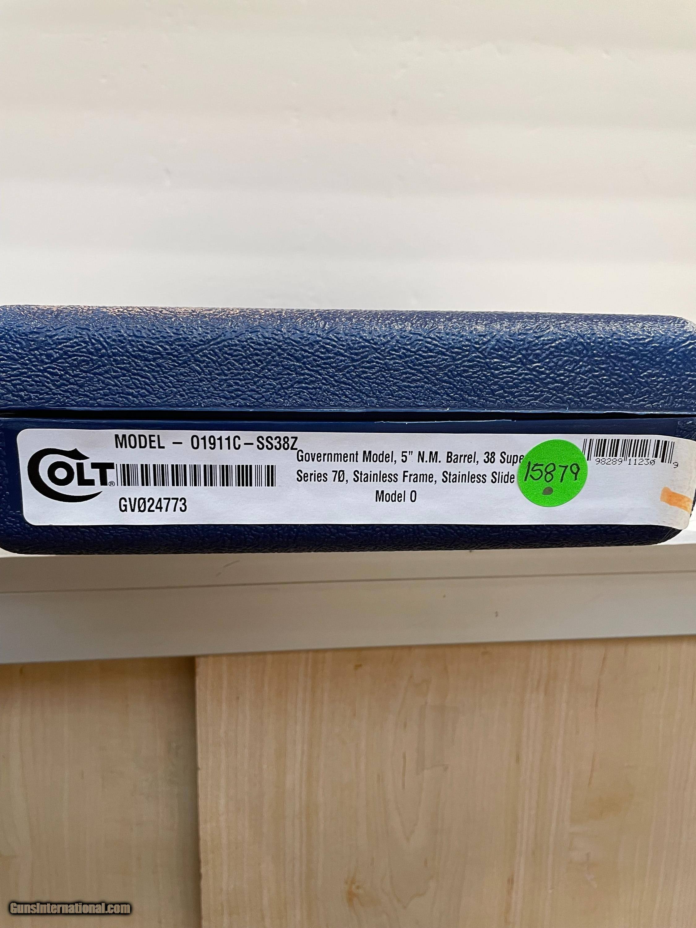 Description: COLT O1911C-SS38Z - 38 SUPER SERIES 70, N.M. BARREL ,CLASSIC GOVERMENT, STAINLESS STEEL FINISH, CUSTOM HAND ENGRAVED & STIPPLED SLIDE & FRAME, CUSTOM HAND ENGRAVED & STIPPLED CHROME AND GOLD PLATED METAL GRIPS. NEW IN COLT BLUE HARD CASE. SHIP TO FFL ONLY. BUYER RESPONSIBLE TO DETERMINE IF FIREARM IS LEGAL IN HIS/HER STATE. BUYER PAYS 3% CREDIT CARD FEE. BUYER PAYS $40.00 SHIPPING TO LOWER 48 STATES. ARIZONA RESIDENTS PAY 6.712% SALES TAX. SOLD Handgun Caliber: .38 Super Auto Manufacturer: COLT Model: O1911C-SS38Z Serial Number: GV02XXXX Condition: New in Box |