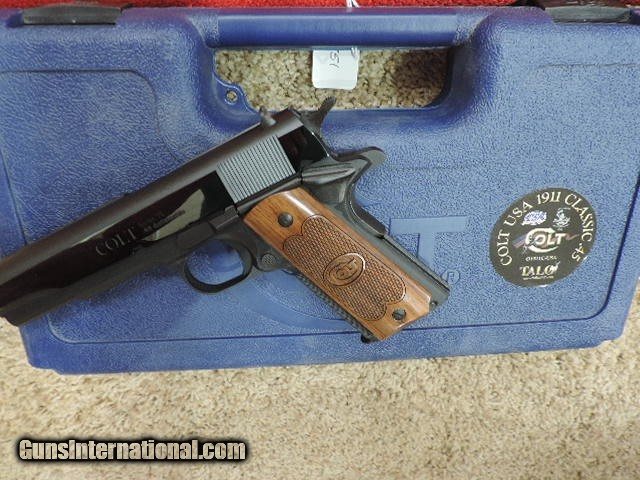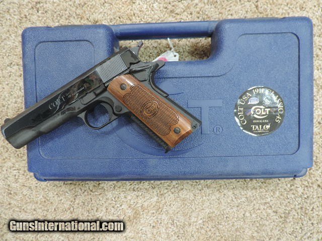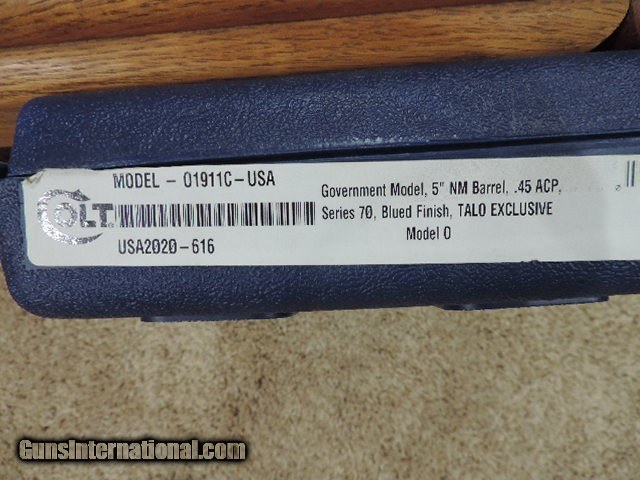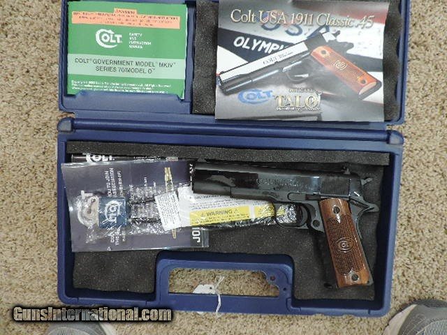 Description: COLT O1911C-USA CLASSIC GOVERNMENT TALO SERIES 70 45ACP HIGH POLISHED BLUE FINISH WITH COLT CHECKERED WOOD GRIPS ROYAL BLUE SLIDE FLATS. DESIGNED BY PETE SINGLE. ONE 7 ROUND MAG. NEW IN BLUE COLT HARDCASE. SHIP TO FFL ONLY. SUBJECT TO PRIOR STORE SALE. BUYER RESPONSIBLE TO DETERMINE IF FIREARM IS LEGAL IN HIS/HER STATE. BUYER PAYS 3% FOR CREDIT CARD. BUYER PAYS $40.00 SHIPPING TO LOWER 48 STATES. ARIZONA RESIDENTS PAY 6.712% SALES TAX. SOLD Handgun Caliber: .45 ACP (.45 Auto) Manufacturer: COLT Model: O1911C-USA Serial Number: USA2020-616 Barrel Length: 5 INCH Condition: New in Box |