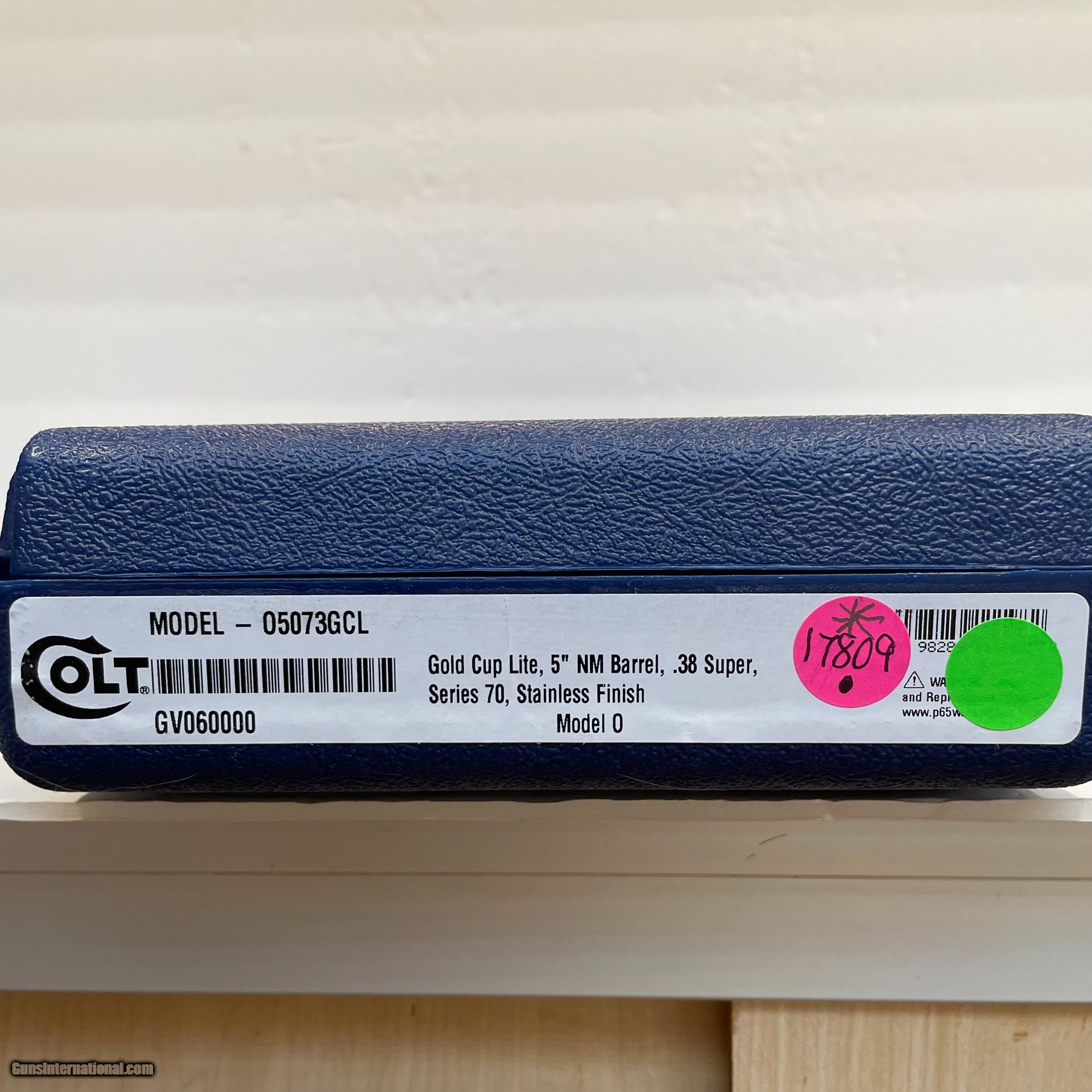Description: COLT O5073GCL GOLD CUP LITE SERIES 70 38 SUPER - STAINLESS FINISH CUSTOM HAND ENGRAVED RECEIVER AND SLIDE. NATIONAL MATCH GOLD CUP WOOD CHECKERED DOUBLE DIAMOND GRIPS WITH COLT GOLD COIN WITH RAMPANT HORSE AND GOLD SCREWS. WIDE ADJUSTABLE ALUMINUM TRIGGER. ONE 9 ROUND MAG. NEW IN BLUE COLT HARDCASE. SUBJECT TO PRIOR STORE SALE. SHIP TO FFL ONLY. BUYER RESPONSIBLE TO DETERMINE IF FIREARM IS LEGAL IN HIS/HER STATE. BUYER PAYS NO FOR CREDIT CARD. BUYER PAYS NO SHIPPING TO LOWER 48 STATES. ARIZONA RESIDENTS PAY 6.712% SALES TAX. SOLD Handgun Caliber: .38 Super Auto Manufacturer: COLT Model: O5073GCL Serial Number: GV06XXXX Condition: NEW IN BOX |