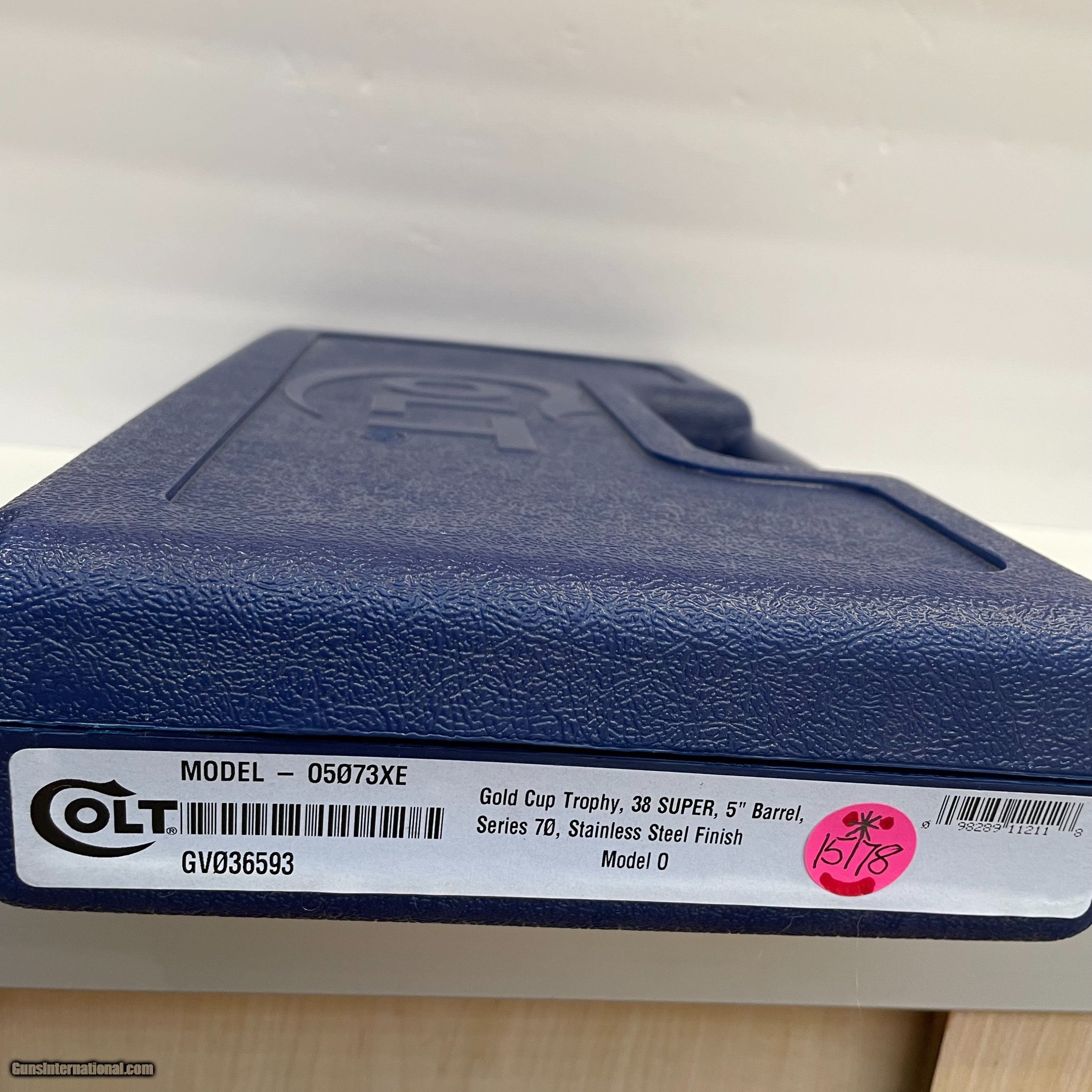 Description: COLT O5073XE GOLD CUP TROPHY SERIES 70 38 SUPER - STAINLESS FINISH CUSTOM HAND ENGRAVED RECEIVER AND SLIDE. CUSTOM HAND ENGRAVED CHROME AND GOLD PLATED METAL GRIPS. WIDE ADJUSTABLE ALUMINUM TRIGGER. ONE 9 ROUND MAG. EXTENDED MAG WELL. NEW IN BLUE COLT HARDCASE. SUBJECT TO PRIOR STORE SALE. SHIP TO FFL ONLY. BUYER RESPONSIBLE TO DETERMINE IF FIREARM IS LEGAL IN HIS/HER STATE. BUYER PAYS 3% FOR CREDIT CARD. BUYER PAYS $40.00 SHIPPING TO LOWER 48 STATES. ARIZONA RESIDENTS PAY 6.712% SALES TAX. SOLD Handgun Caliber: .38 Super Auto Manufacturer: COLT Model: O5073XE Serial Number: GV03XXXX Barrel Length: 5 INCH. Condition: New in Box |