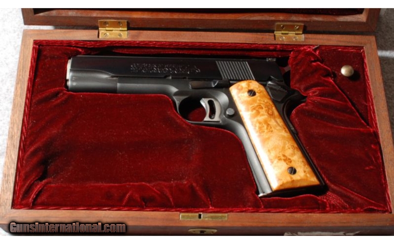 Description: SOLD Caliber Info: .45 ACP Metal Condition: Some wear Wood Condition: Some wear Bore Condition: Shiny, rifling sharp Barrels: 5 Triggers: Adjustable Stock: Wood Weight: 39 ounces Sights: Elliason adjustable rear, blade front Extras: Wood case Item Location: Rapid City, SD |