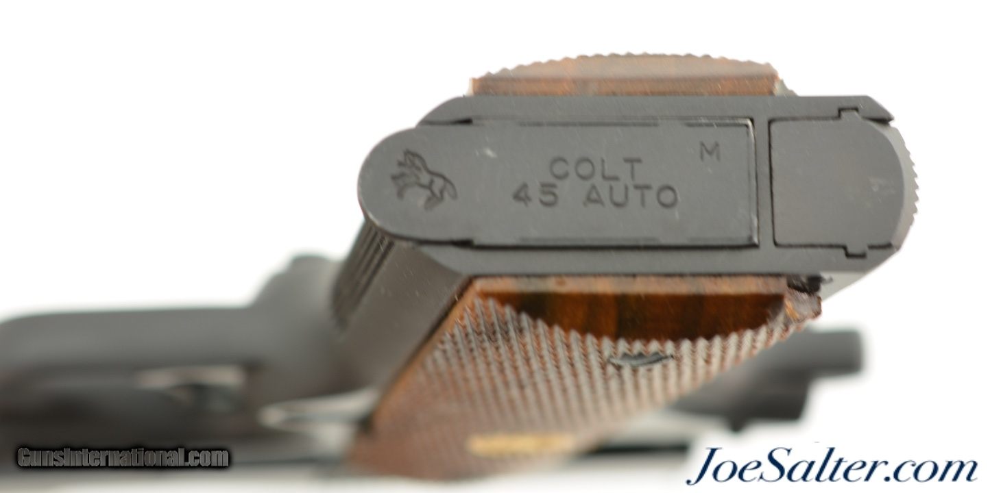 Description: Serial #70N87778, .45 ACP, 5" barrel with an excellent, bright bore. This is a 1980-made pistol that features a National Match barrel, ribbed slide, Elliason rear target sight, and adjustable skeleton target trigger. The pistol exhibits almost no evidence of use and retains practically all of the original blued finish, while the checkered wooden Colt medallion grips likewise have almost no evident wear. The pistol comes with a single magazine, and is housed in the original numbered Colt woodgrain box with styrofoam clamshell. This is a splendid Series ‘70 Gold Cup and is in virtually new condition overall. FFL SOLD |