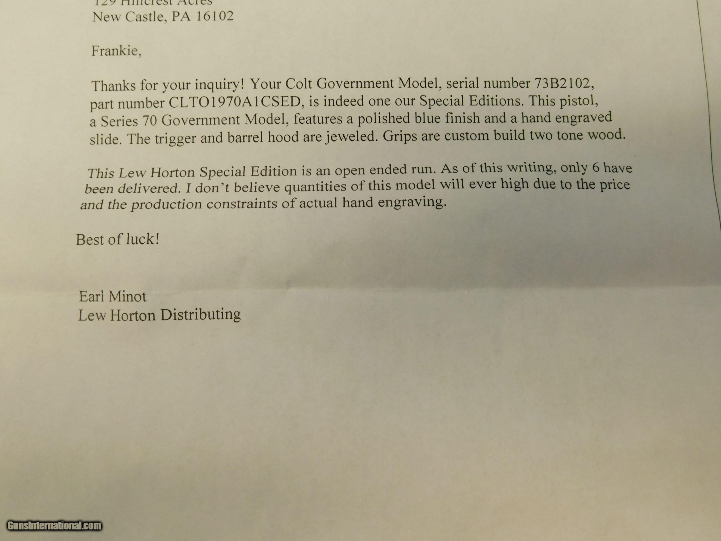 Rare desirable Lew Horton Handengraved Colt Government Model 70 Series NIB 1 of 6