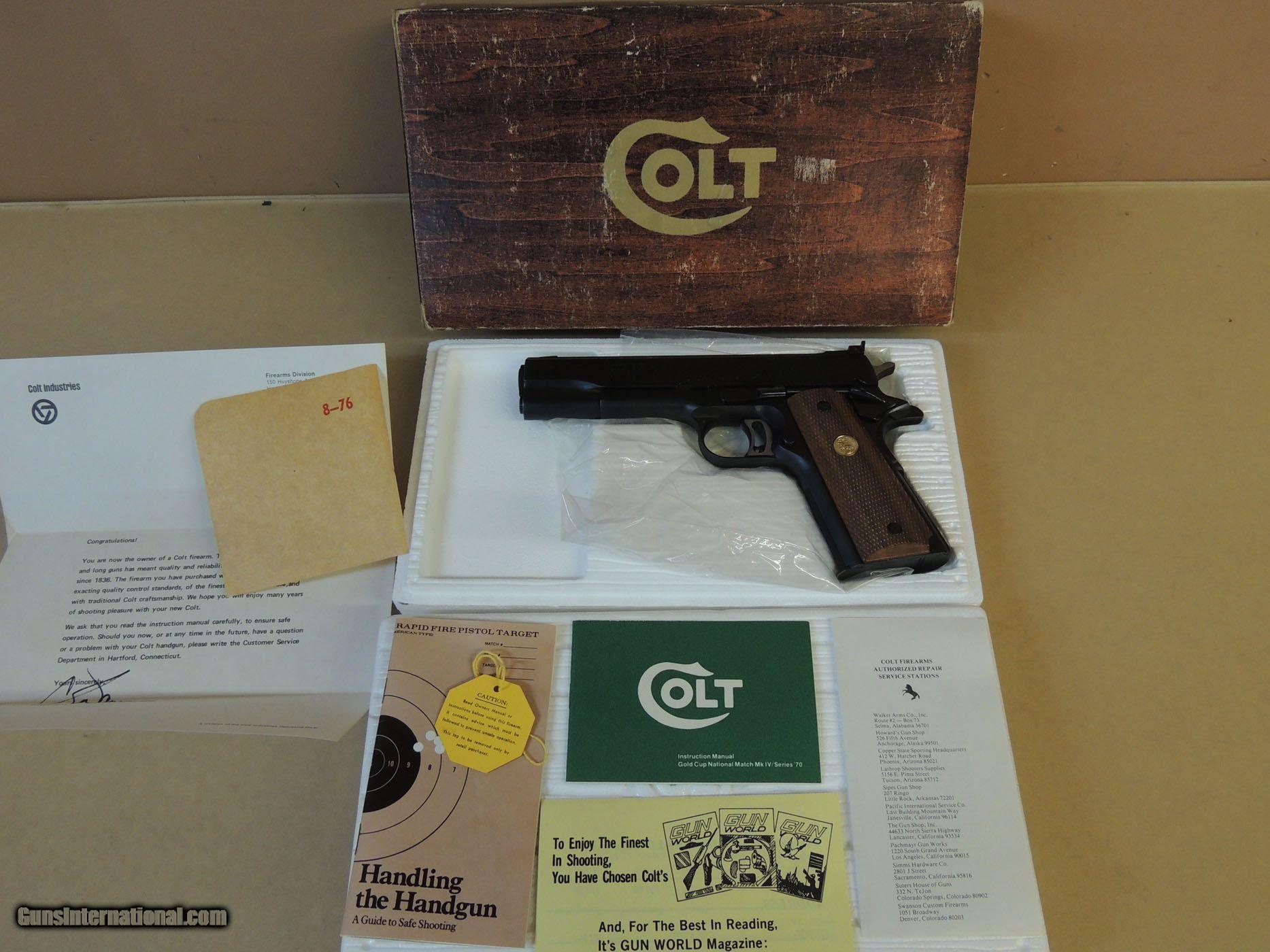 Description: SALE PENDING----------------------------------------------------------COLT SERIES 70' GOLD CUP NATIONAL MATCH .45ACP PISTOL IN BOX, 98% BLUE, IN BOX WITH EXTRAS AS SHOWN, MFG CIRCA 1978 $1799 ******* (PLEASE REFERENCE OUR INVENTORY NUMBER) (PAYMENT OPTIONS) (Postal Money Order) (Cashiers Checks) (Personal Checks (Item held until Check Cleared) ***(Layaway 120 days-(No Interest)-(Pay any way, any time you like over the term) -(Deposit required)*** (Credit Cards Visa or Master Card 3% fee added to total sale) (GA residents 7% sales Tax Applies) (FAX 888-597-1394) (BEST PHONE/TEXT 229-424-8450) (Shipping $35.00) SOLD |