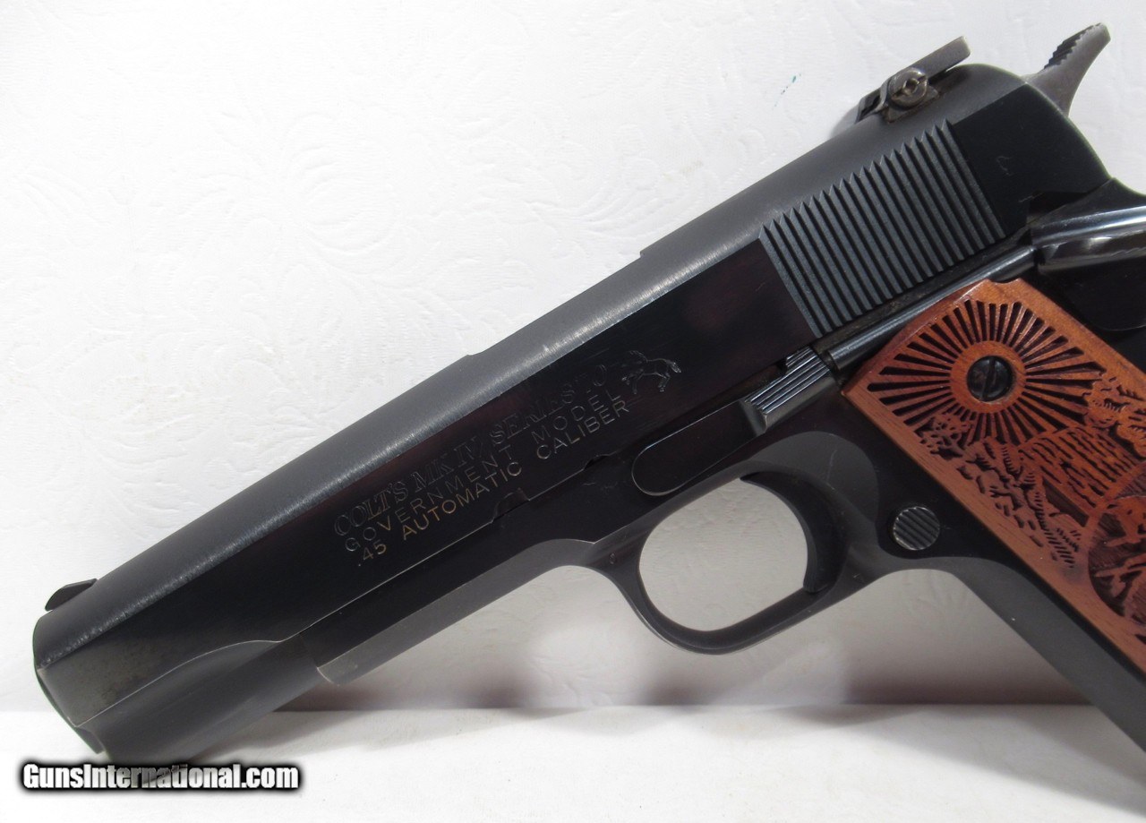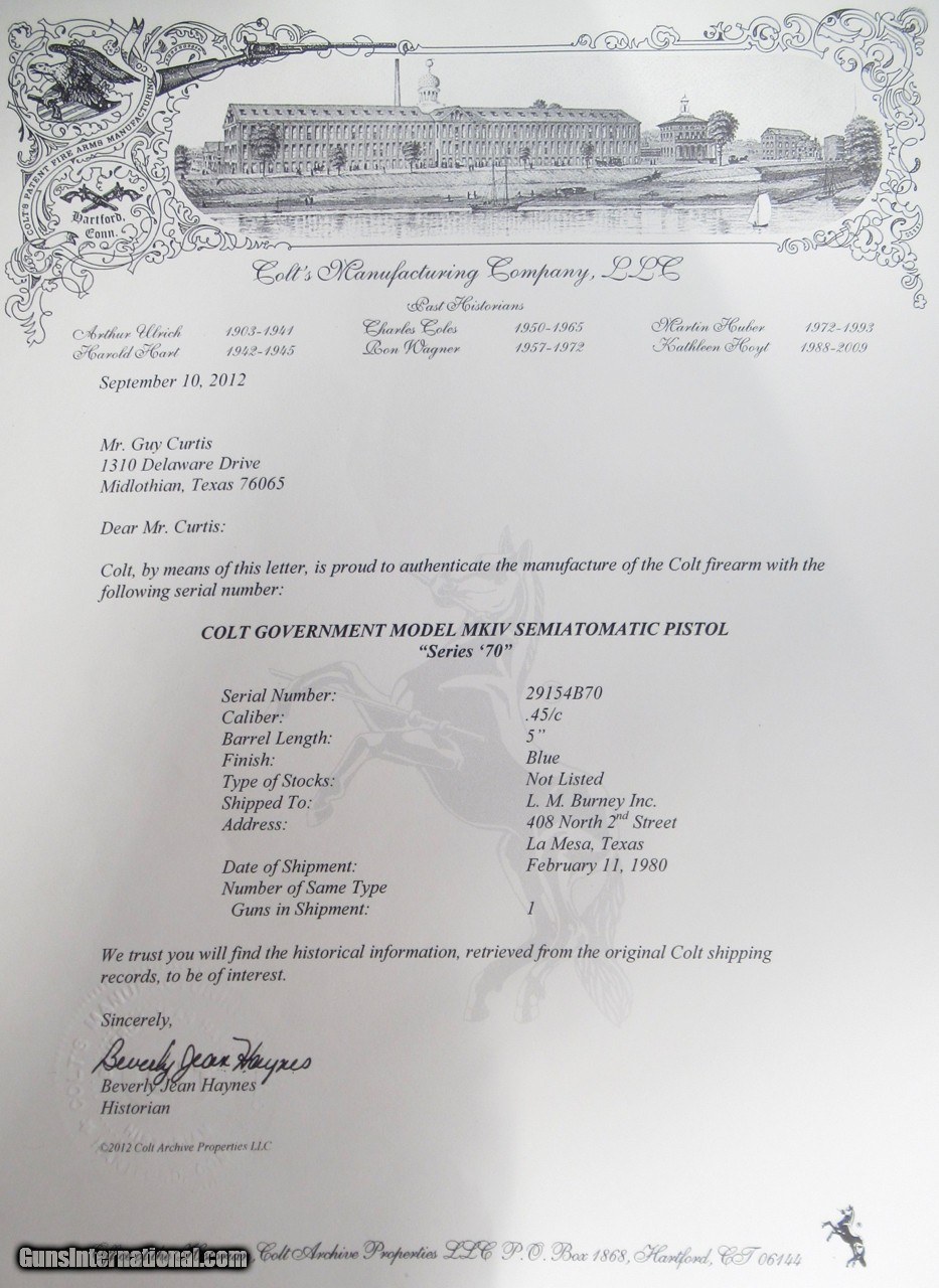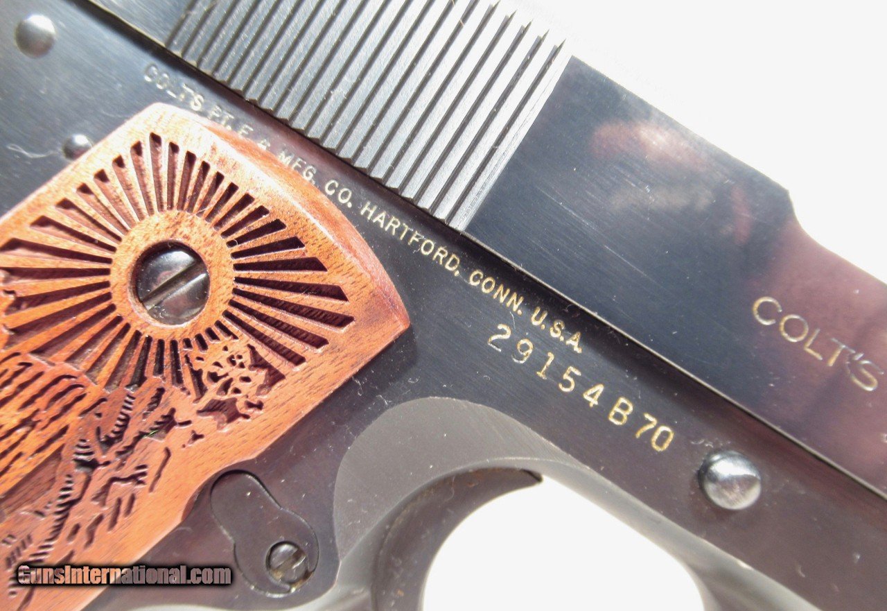 Description: SOLD--Colt Government Model “Series ‘70” .45 Pistol; Serial No. 29154B70; Per Included Factory Letter: .45 Caliber with 5” Barrel and Blue Finish; Shipped to L.M. Burney Inc. of La Mesa, Texas on February 11, 1980; Slide Engraved ‘George “Gomez” Fraiser CO. E Texas Rangers’; Fancy Colt Factory Wood Grips; High Edge Blue Wear; Purchased in 2012 from Ranger Fraiser by Guy Curtis; 100% Correct; See All Photos for Condition; No Texts; Call (254)541-5765 or Email Only; PERSONAL PROPERTY of Harold Wieser; Price: $6,975 + $45 S&H Via USPS PRIORITY MAIL; Payment Address: Harold Wieser - 1466 U.S. Hwy 77 - Rosebud, TX 76570; SEND PAYMENTS VIA USPS PRIORITY MAIL; BEWARE of SCAMS!!! – DO NOT SEND MONEY or CORRESPONDENTS ELECTRONICALLY UNLESS YOU HAVE SPOKEN to HAROLD WIESER FIRST! 254-541-5765 SOLD Manufacturer: Colt Model: 1911 Government Serial Number: 29154B70 |