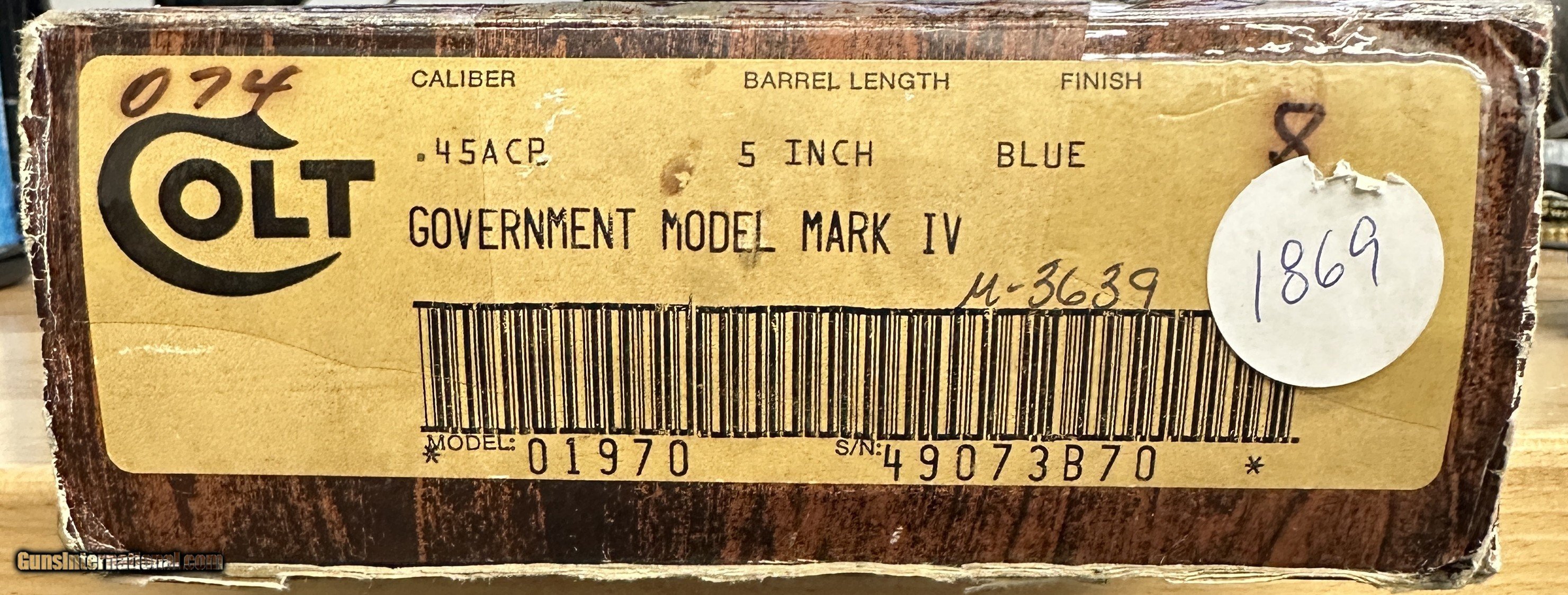 Description: Colt Mk. IV Series 70 .45 ACP Government Model 1980 production in unfired condition. Overall a beautiful firearm and ready to collect or shoot. Please review pictures and feel free to ask any questions. Reasonable offers will be considered. Must Ship to FFL From FFL . Full Insurance for purchase price agreed on . All shipping and insurance cost will be paid by the purchaser. Money Order and in person pick up prefer. If a check is sent up to 15 bassness days will be taken for verification of funds. SOLD |