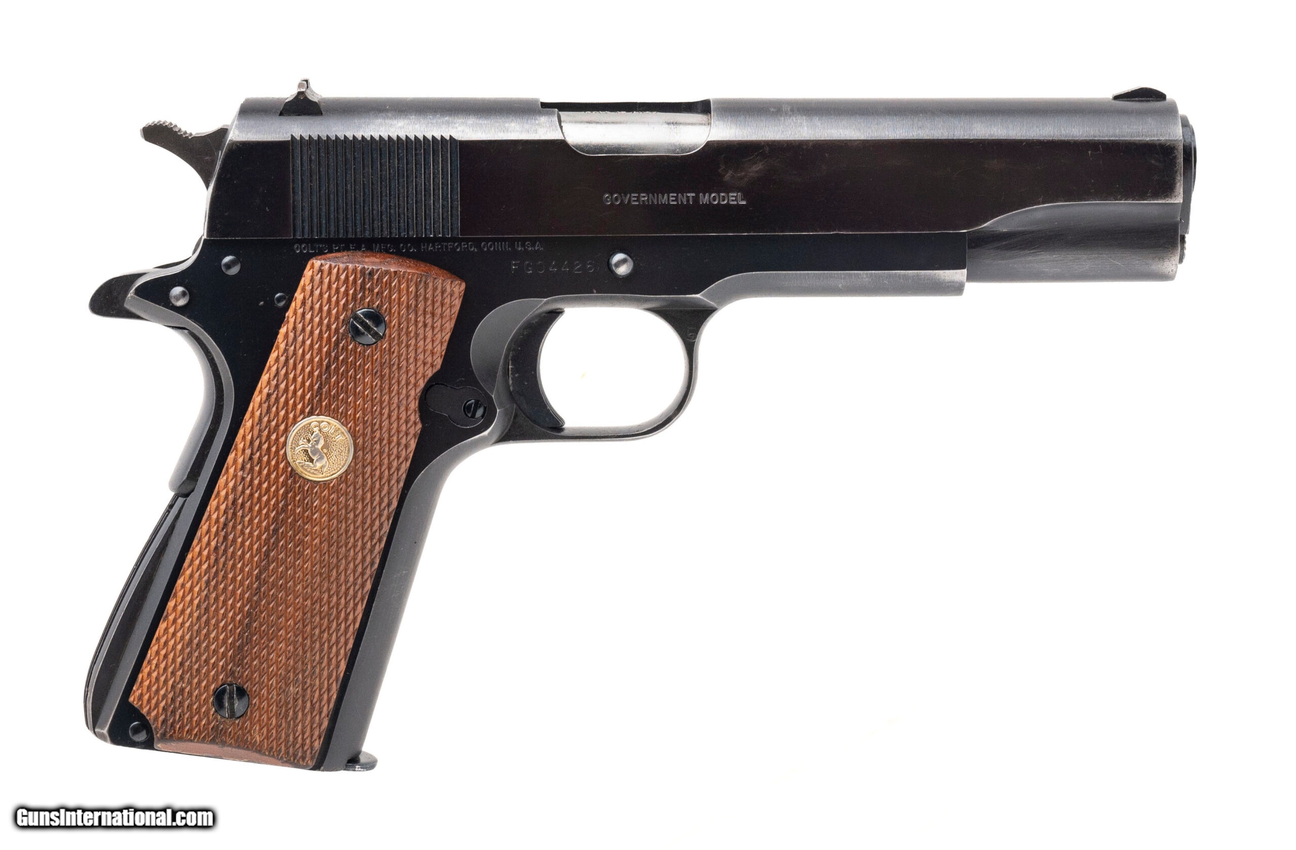 Description: "SN: FG04426. Made in 1983, .45 Auto with a 5"" barrel. Bore is bright with strong rifling. Government size blued 1911 pistol with checkered wood grips. Overall condition is good. (Consignment) SOLD |