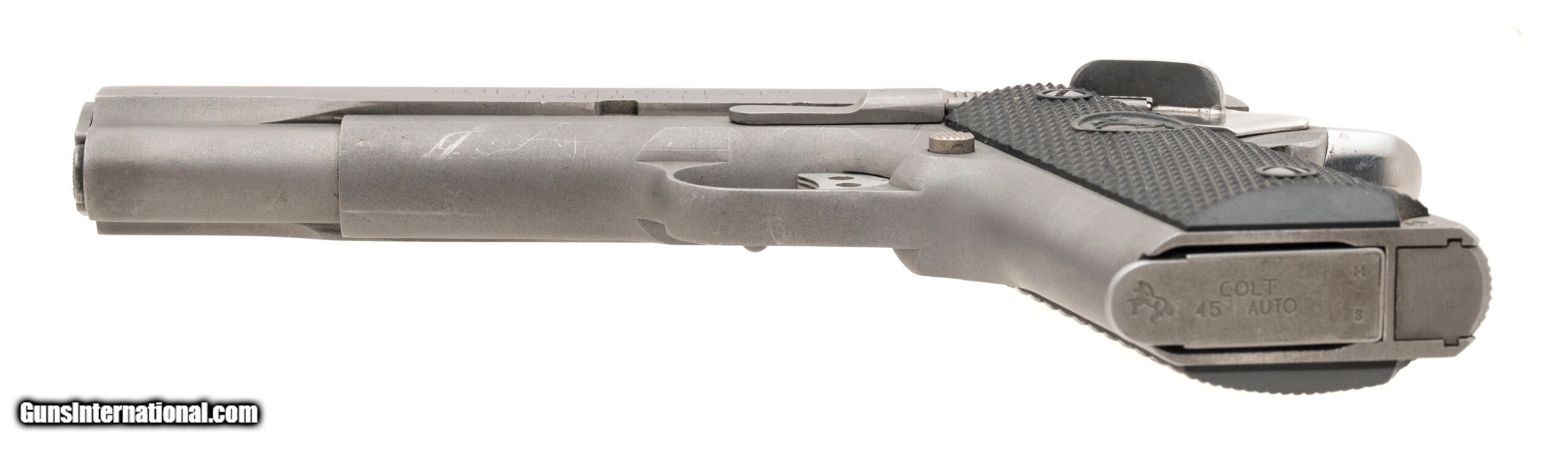 Description: "SN: CV01113. Made in 1995, .45 Auto with a 5"" barrel. Bore is bright with strong rifling. Government size stainless steel 1911 pistol. Sights, thumb safety, and grip safety have all been added. Overall condition is very good. SOLD |