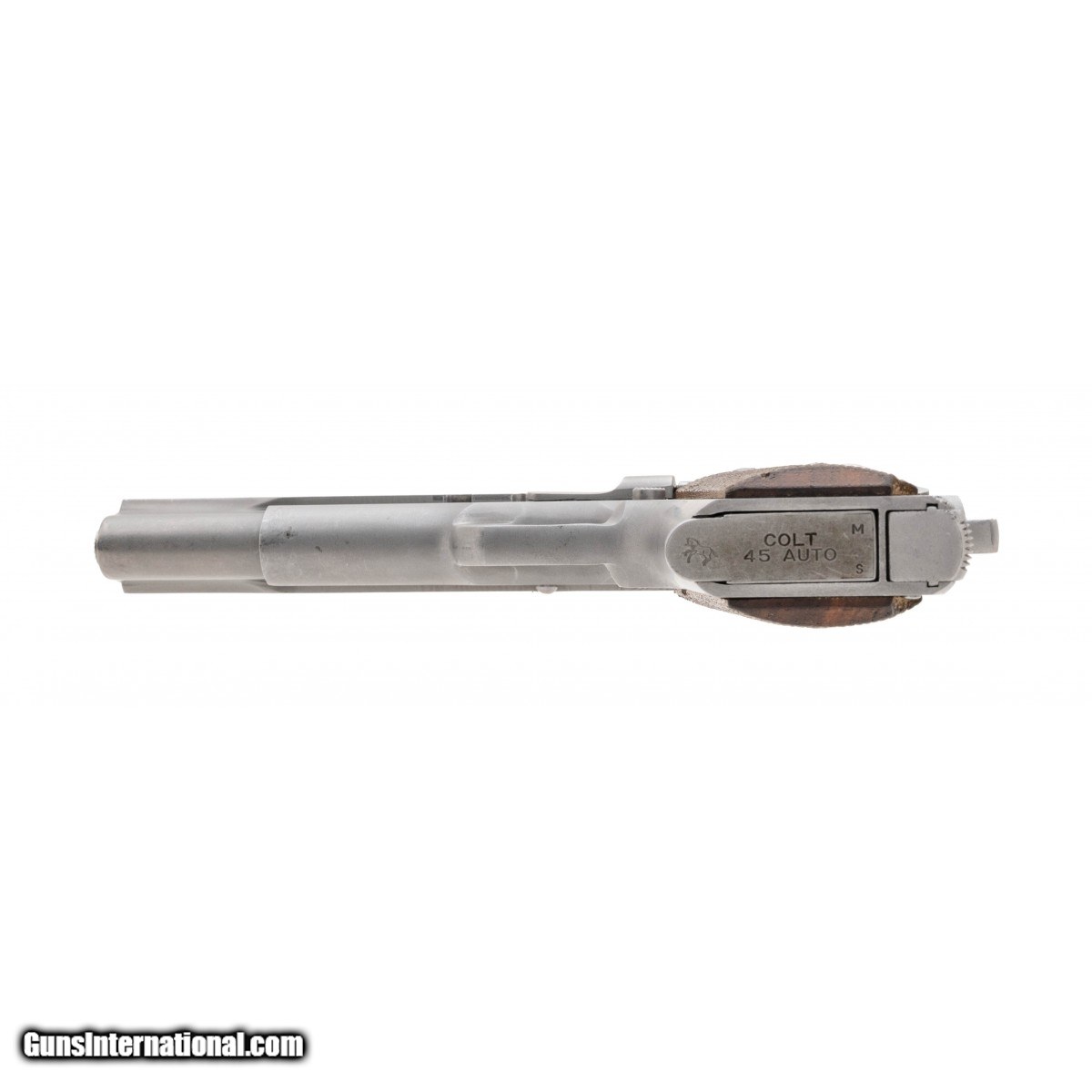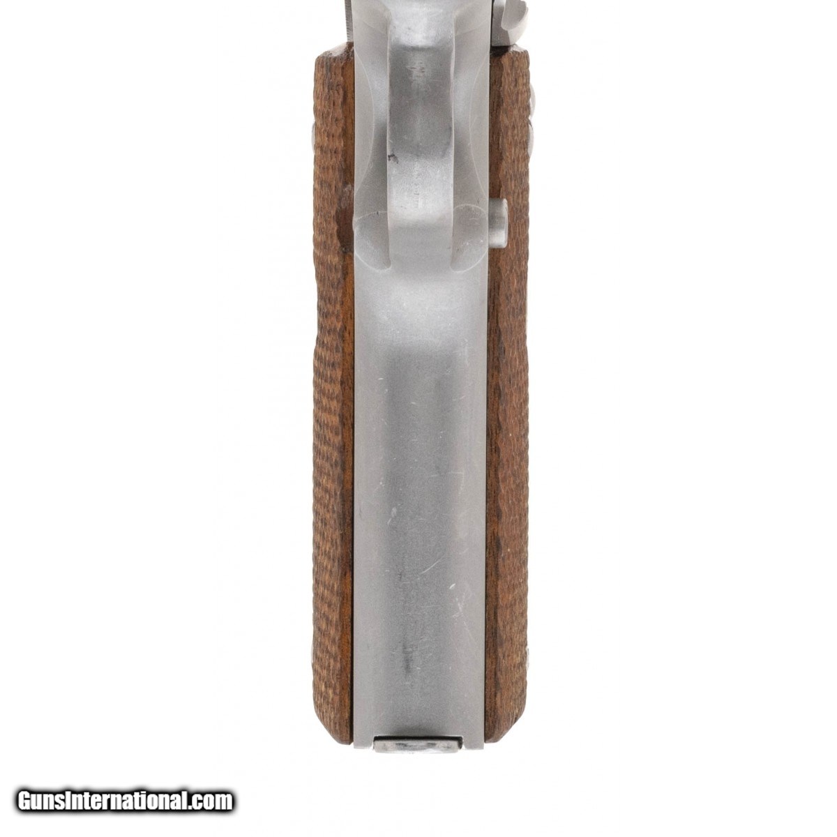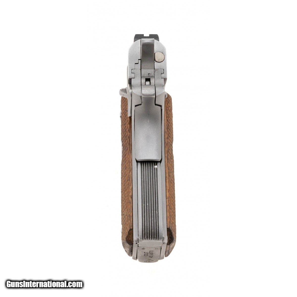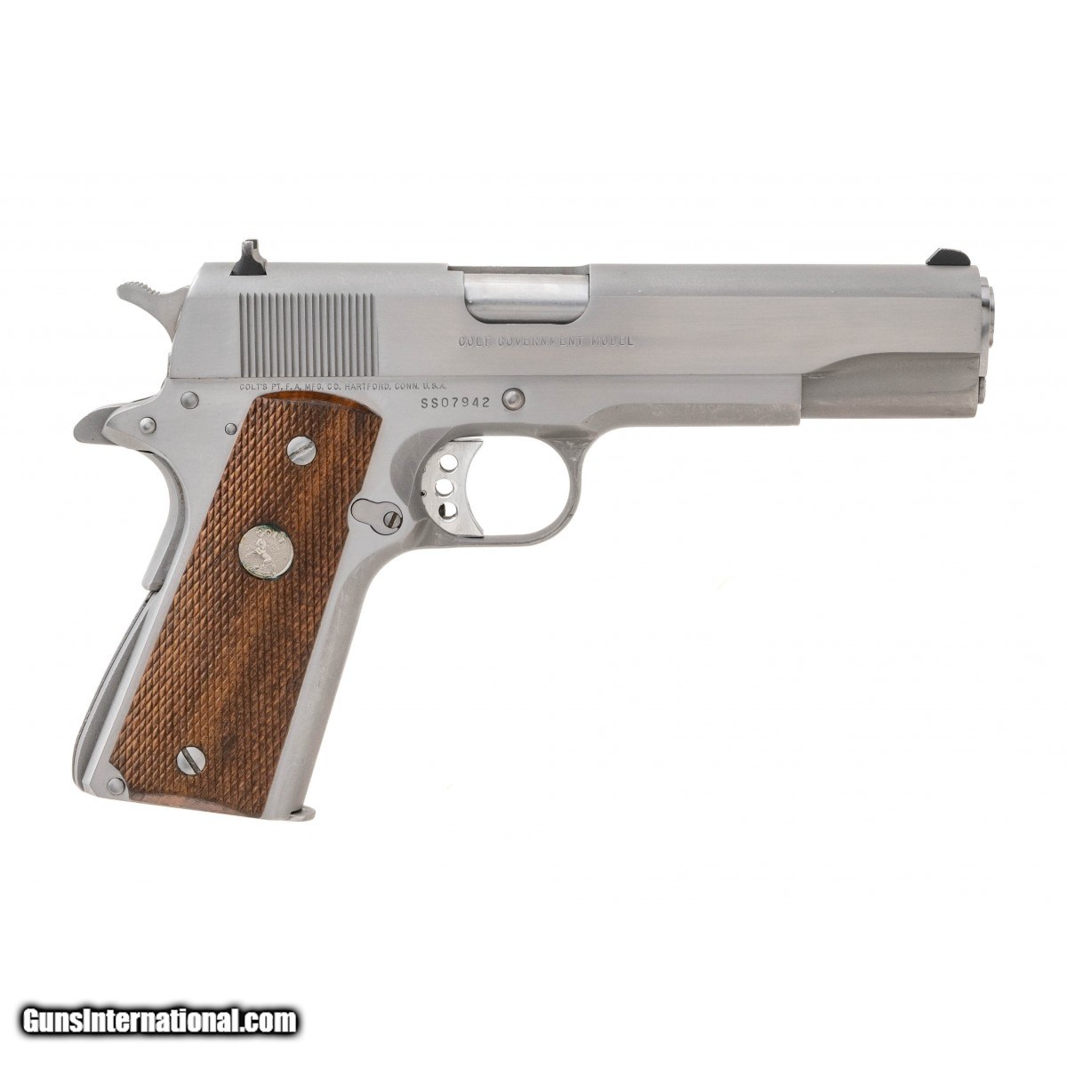 SN:SS07942. Manufactured in 1985, .45 ACP, 5"" barrel. Stainless full sized 1911 with Colt checkered wood grips. Overall very good condition.