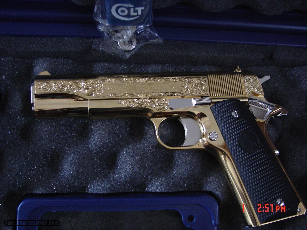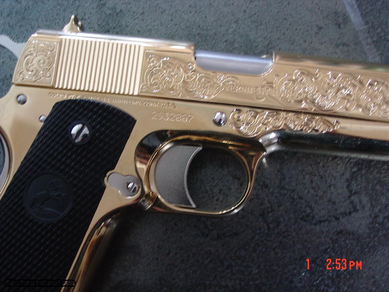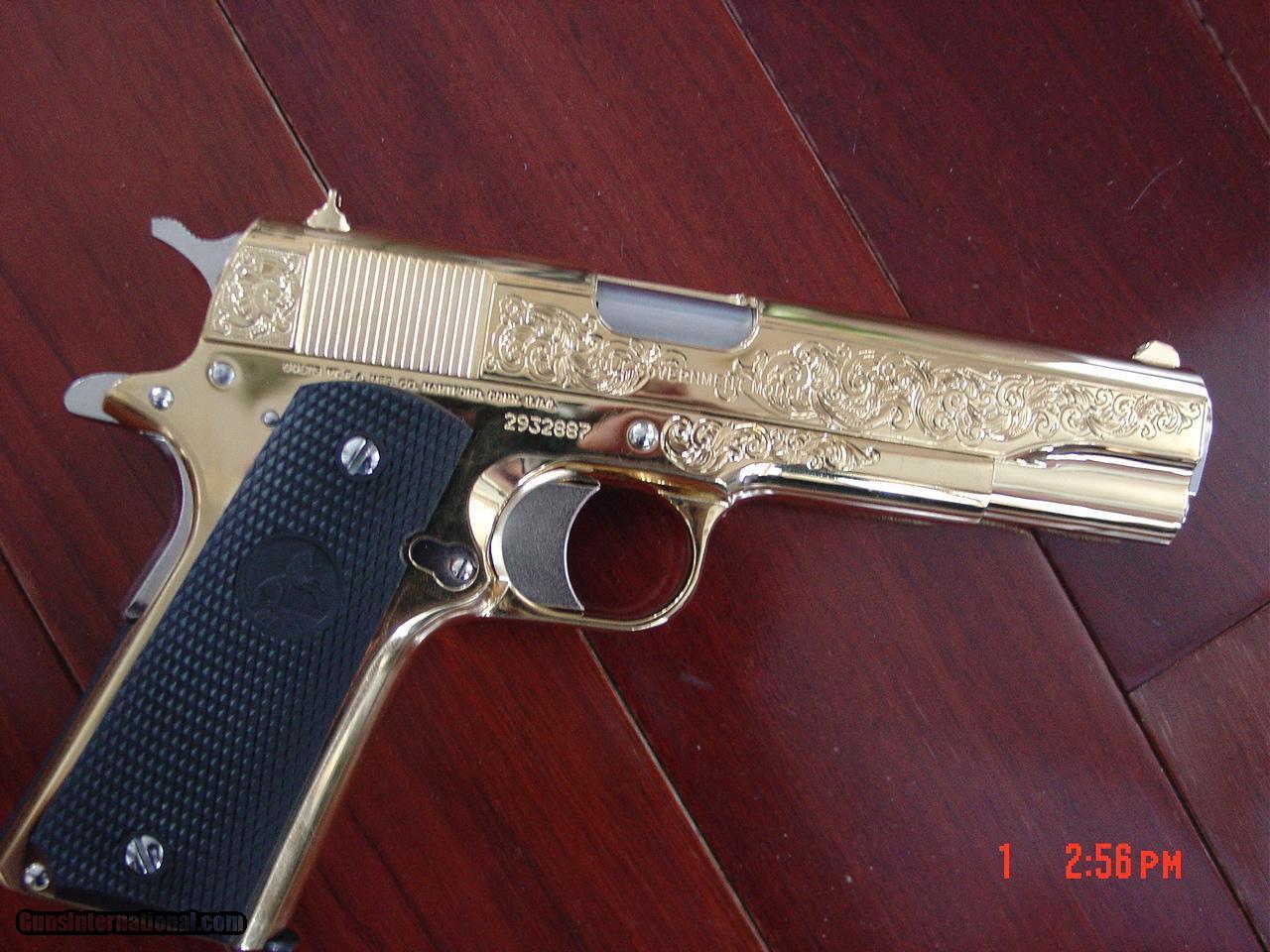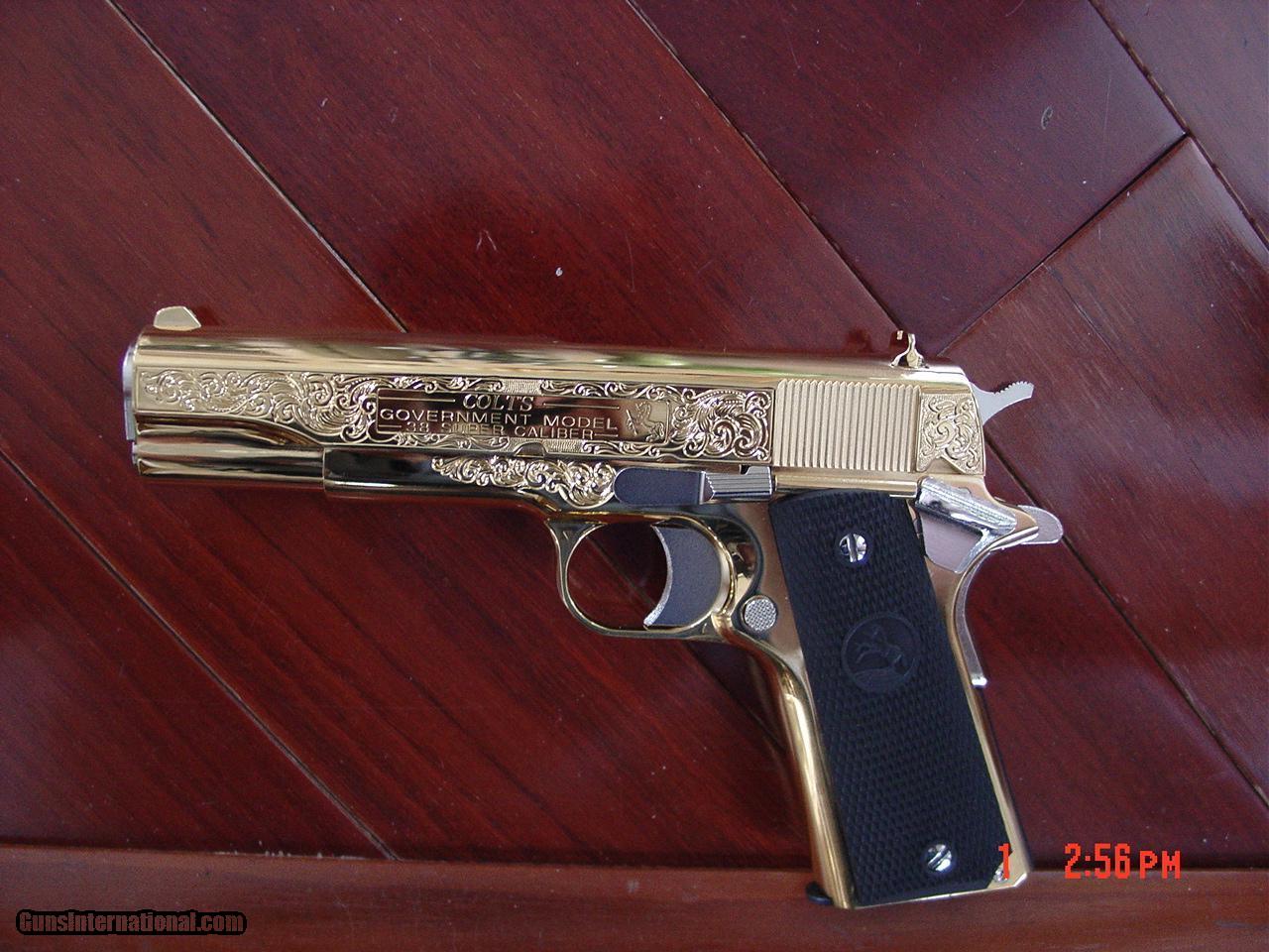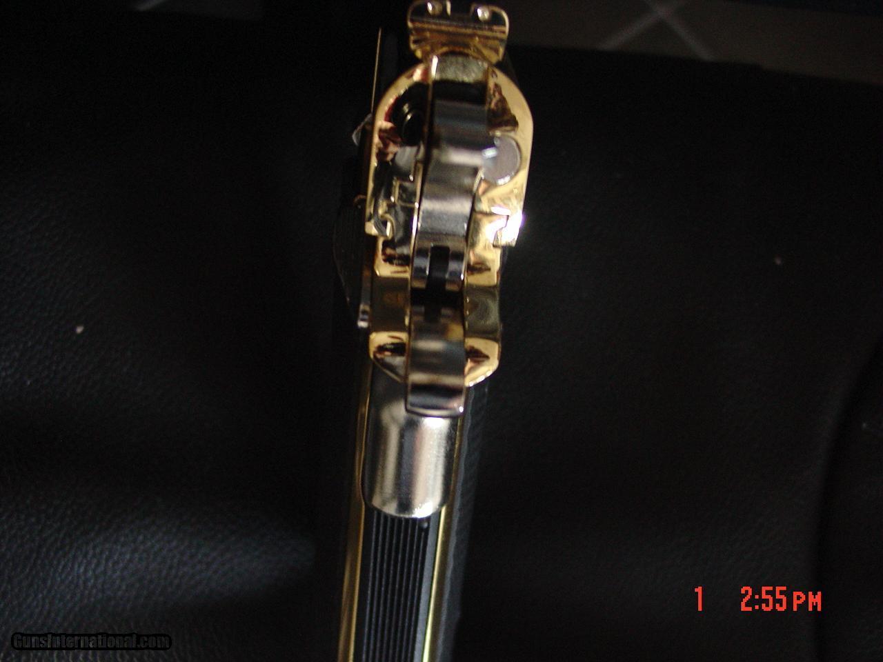 Description: Here is an awesome 1 of a kind showpiece,Colt Government in 38 super,5" barrel, fully 24K Gold plated with a few nickel accents,& master engraved slide by Seattle Engravers, with black Colt grips, & its so shiny,it reflects everything,& tough to get great photos of the engraving,so its way nicer in person, & has 2 magazines,Colt carry case with lock,owners manual & hang tag. its brand new & unfired. it was of course blued finish to start with. serial #2932887 semi automatic with grip safety. a real steal at only $2995.firm +$40.shipping to your FFL dealer only. I am an FFL dealer, located in the Clearwater,Florida area, I accept bank wire transfers,direct deposits to Wells Fargo Bank, cashiers checks, postal & bank money orders,or business & personal checks, but those take time to clear.no credit cards or PayPal-sorry I now offer 60 day layaways with 1/3rd down & 1/3rd per month.be sure to check out all my other unique listings. SOLD |