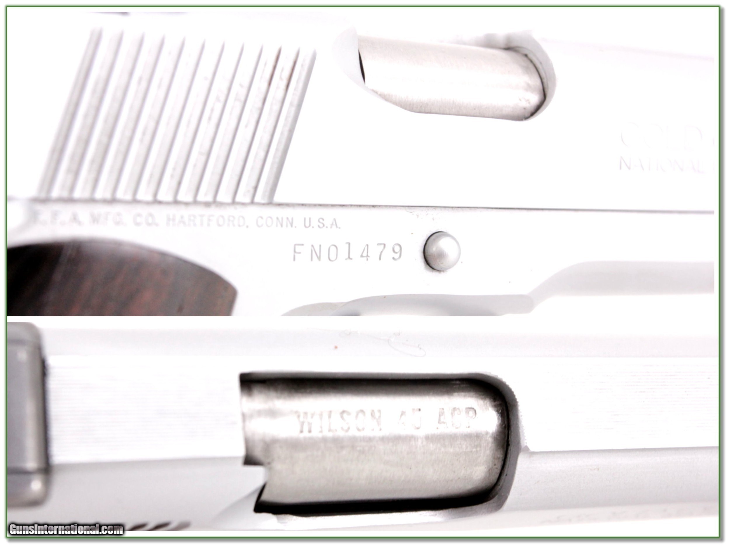 Description: This is a stainless Colt Gold Cup National Match Series 80 in 45 ACP. It has a Wilson Combat barrel and magazine. It has light use with just a few minor marks. I am selling this one on consignment and as such lay-a-way can’t be used. It does of course have the standard 3-day inspection. Shipping with insurance is $39. Please email me with any questions or larger pictures. (Consign your quality firearms with Shooting Investments for only 12%! Let me know if you have any you would like to sell!) 19-0662 Payment: Payment is by Money Order, Cashiers Check or Personal Check. I can now also accept MasterCard and Visa with a 3% convenience fee. PayPal can be used for some items but never firearms. Please let us know if you would like to pay via PayPal. Shipping: The shipping charge will be listed in each description. It is $39 for most guns. Some heavy guns or those insured for over $2000 will be higher. Shipments to Alaska and Hawaii are higher because air shipment is required. Most firearms are shipped on Tuesday and Thursday and usually in 5 days of receipt of payment. We package all shipments carefully and insure them. Returns: Our return policy is simple. If for any reason you are not pleased with your purchase, you may return your item for a full refund of purchase price. Ammunition cannot be returned. It is important to us that you are happy. Guns cannot be fired or dissembled before returning them and they must be returned in the same condition as received. Notification of a return must occur with-in 3 days of receipt at your dealer. Shipping, convenience and dealer fees are not refundable and are the responsibility of the buyer. Lay-a-way: If needed, we offer a 60 day lay-a-way option on most firearms. It is 1/3 now, 1/3 in 30 days and 1/3 in 60 days. Lay-a-way firearm sales are final and if not completed the first payment cannot be returned. Consigning your firearms with Shooting Investments: We will help you get top dollar for your firearms. While most local guns shops charge 20% or more, our fee is only 12% with a minimum of $75. At your local gun shop it might take months to sell. Selling on-line provides instant access to thousands of interested buyers. You won’t find any other on-line dealer willing to sell your firearms for only 12% or listing every gun on 3 separate s. Selling through an House typically costs the seller 15% and the buyer an addition 15% (so 30%) and you have to wait several months to sell and longer to receive funds. If properly priced, we will sell your firearms in a few weeks. Send us an email or give us a call and we’ll explain how easy it is for you to get top dollar. Trading: Trading for use is really just buying your gun to re-sell. If you have a gun you want to trade, please email a picture and we will let you know what we can give or it. You will always get more if we sell it for you on consignment. Help for California Buyers: We are happy to ship to California. It is the buyer’s responsibility to make sure any item you buy is legal in your state. We are also happy to help with your purchase of a firearm from someone other than us. If you see a gun you would like to buy but the seller can’t or won’t ship to California they can ship to use and we’ll then ship it to your California dealer. The cost for this service is only $30 + shipping. Let us know if we can help! Payment: Payment is by Money Order, Cashiers Check or Personal Check. I can now also accept MasterCard and Visa with a 3% convenience fee. PayPal can be used for some items but never firearms. Please let us know if you would like to pay via PayPal. Shipping: The shipping charge will be listed in each description. It is $39 for most guns. Some heavy guns or those insured for over $2000 will be higher. Shipments to Alaska and Hawaii are higher because air shipment is required. Most firearms are shipped on Tuesday and Thursday and usually in 5 days of receipt of payment. We package all shipments carefully and insure them. Returns: Our return policy is simple. If for any reason you are not pleased with your purchase, you may return your item for a full refund of purchase price. Ammunition cannot be returned. It is important to us that you are happy. Guns cannot be fired or dissembled before returning them and they must be returned in the same condition as received. Notification of a return must occur with-in 3 days of receipt at your dealer. Shipping, convenience and dealer fees are not refundable and are the responsibility of the buyer. Lay-a-way: If needed, we offer a 60 day lay-a-way option on most firearms. It is 1/3 now, 1/3 in 30 days and 1/3 in 60 days. Lay-a-way firearm sales are final and if not completed the first payment cannot be returned. Consigning your firearms with Shooting Investments: We will help you get top dollar for your firearms. While most local guns shops charge 20% or more, our fee is only 12% with a minimum of $75. At your local gun shop it might take months to sell. Selling on-line provides instant access to thousands of interested buyers. You won’t find any other on-line dealer willing to sell your firearms for only 12% or listing every gun on 3 separate s. Selling through an House typically costs the seller 15% and the buyer an addition 15% (so 30%) and you have to wait several months to sell and longer to receive funds. If properly priced, we will sell your firearms in a few weeks. Send us an email or give us a call and we’ll explain how easy it is for you to get top dollar. Trading: Trading for use is really just buying your gun to re-sell. If you have a gun you want to trade, please email a picture and we will let you know what we can give or it. You will always get more if we sell it for you on consignment. Help for California Buyers: We are happy to ship to California. It is the buyer’s responsibility to make sure any item you buy is legal in your state. We are also happy to help with your purchase of a firearm from someone other 