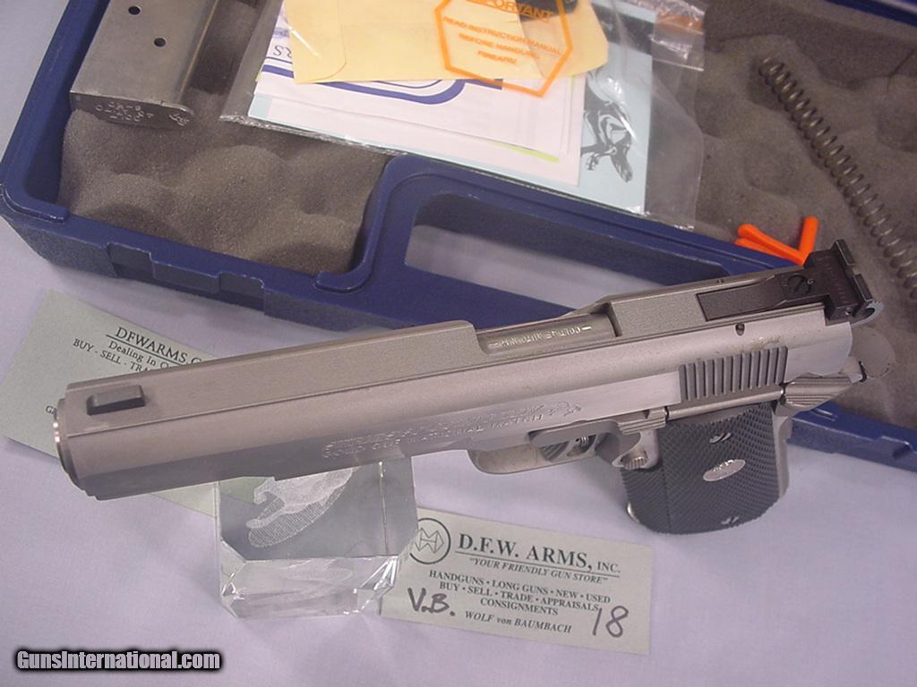 Description: COLT GOLD CUP NATIONAL MATCH STAINLESS STEEL NIB .45 ACP. MODEL # 05070E, SER. # 28558E,IN ORIGINAL BOX NUMBERED TO GUN WITH MANUALS ET. EXTRA MAG AND EXTRA SPRING , 5 INCH BRL.THERE IS SOME DRIED OIL STILL ON THE GUN ,THIS GOLD CUP IS A RARE COLLECTORS ITEMS. PLS. ADD $ 55. FOR S/H/INS TO YOUR FFL WE HAVE ANOTHER GOLD CUP IN BLUE IN 70 SER. WITH ORIG. BOX WILL BE POSTED ASAP SOLD |