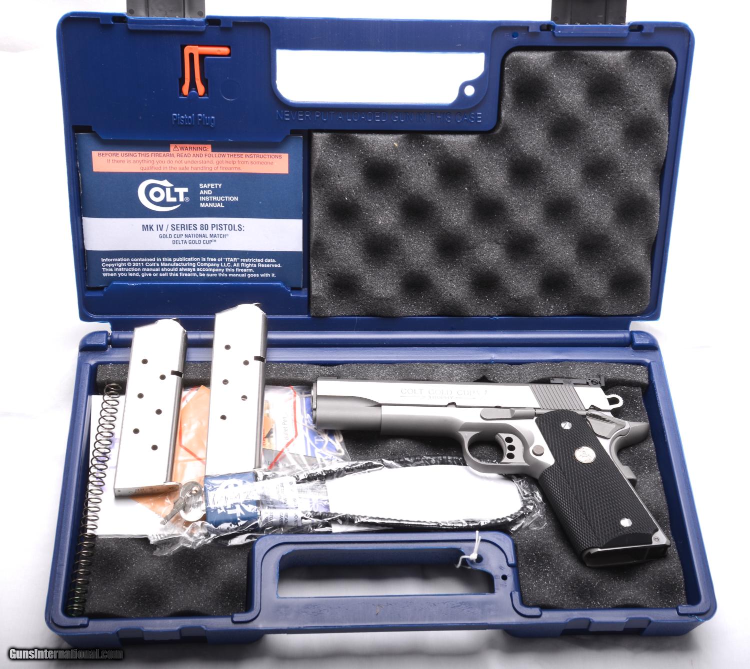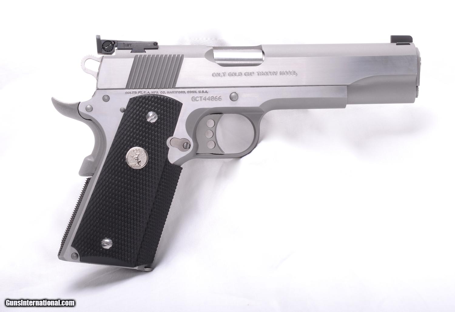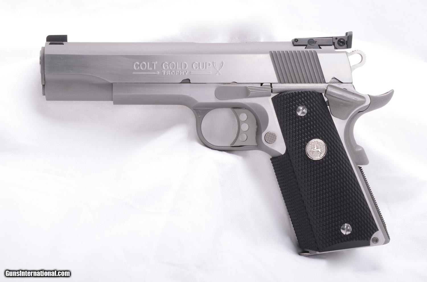 Description: Colt Gold Cup Trophy Model .45 acp pistol. Made in the late 1990’s this stainless steel Gold Cup Trophy appears to be As New In Box. The “As” is because this gun could have been test fired but at a minimum the overall condition is 98%+. It is in its original box with all paperwork, 2nd mag and accessories. SOLD |