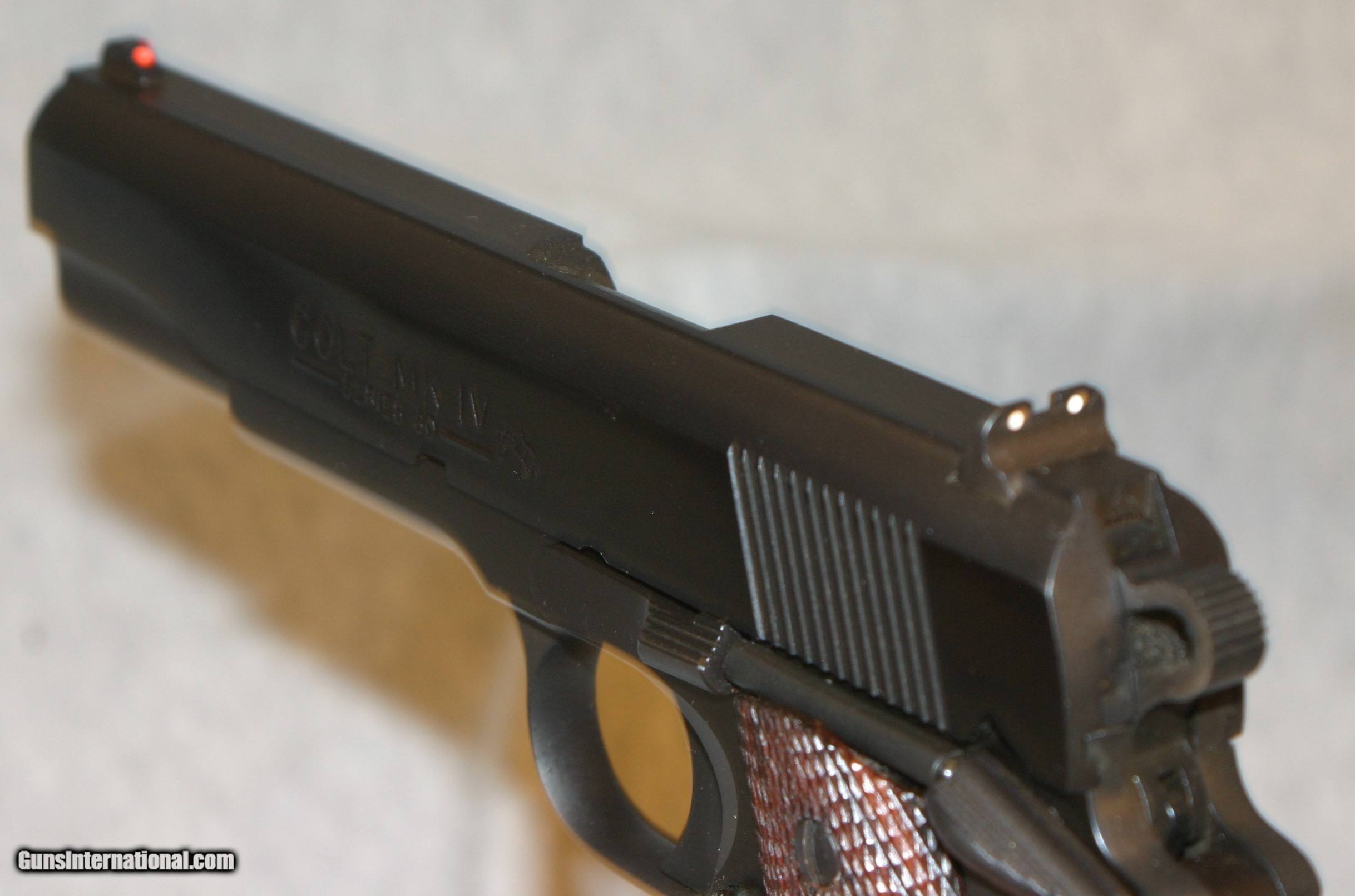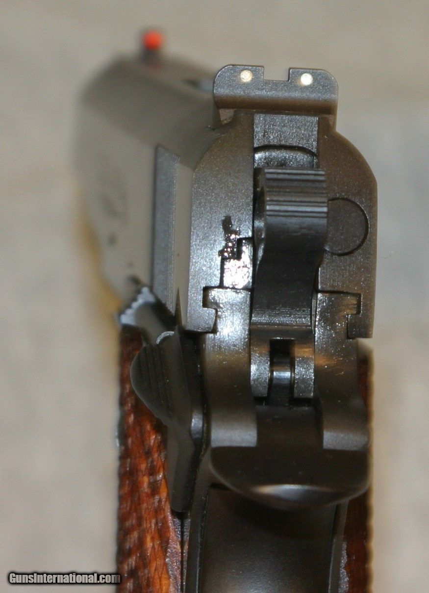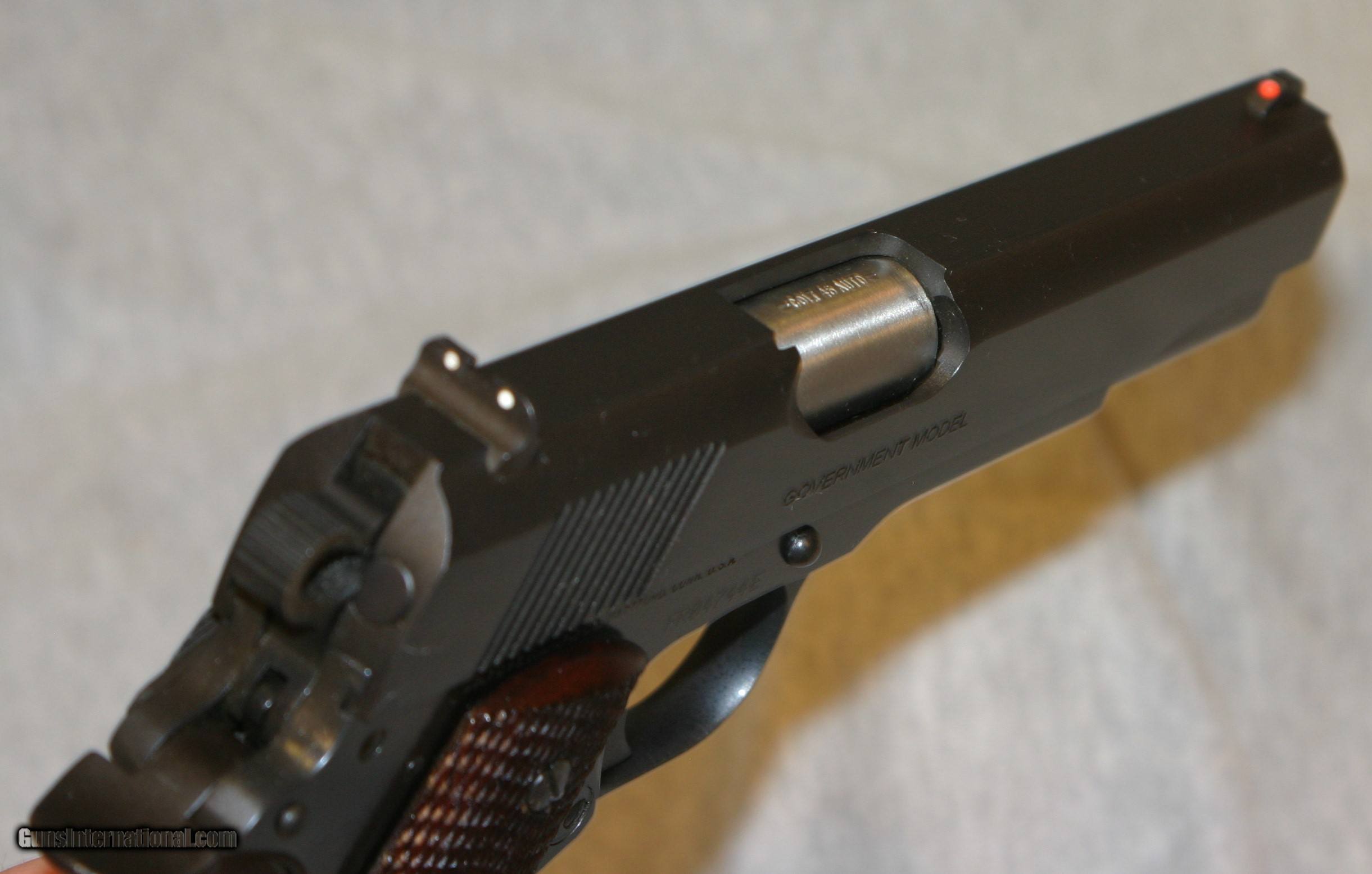 Description: EXCELLENT CONDITION 80 SERIES GOVERNMENT WITH THE FLAT TOP SLIDE, RICH DARK BLUE AND FULL CHECKERED WALNUT GRIPS, 8 RD MAG,3 DOT SIGHTS SOLD |