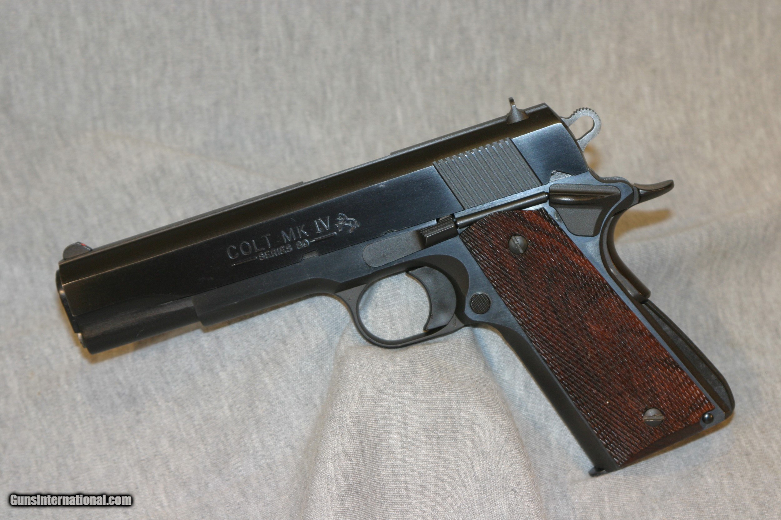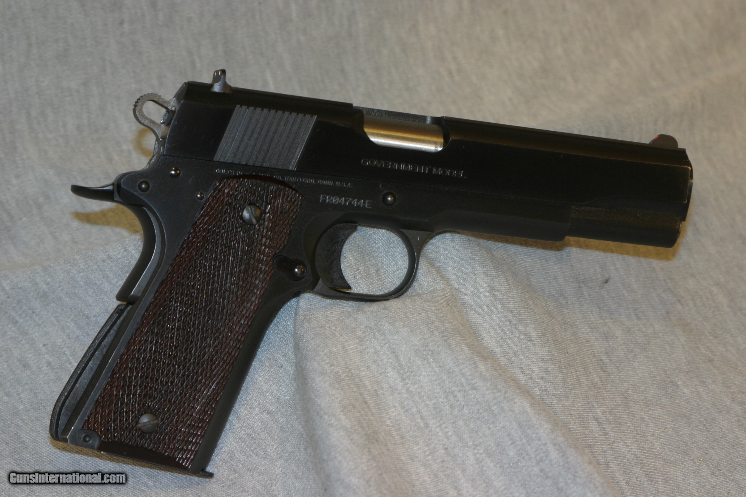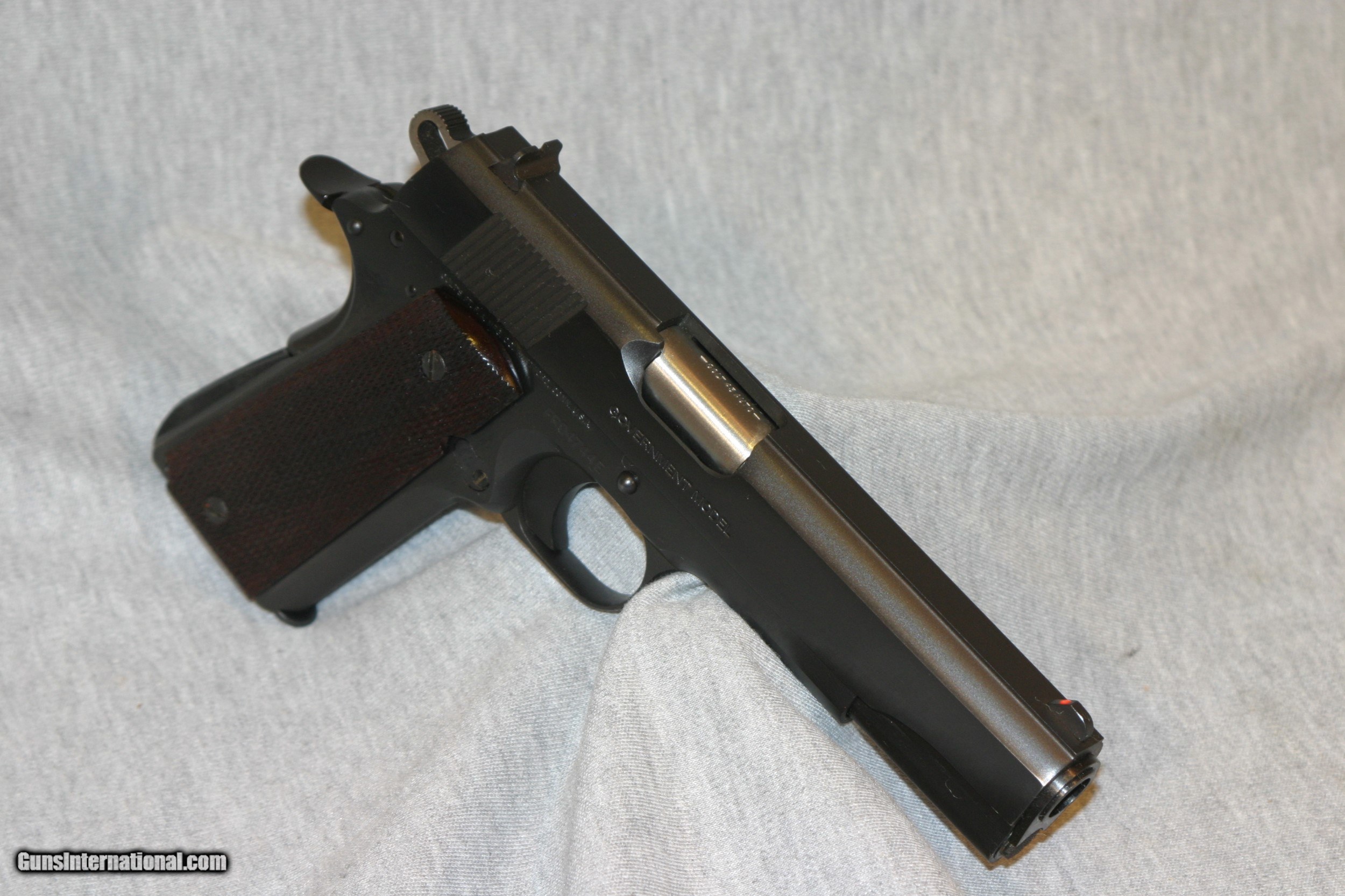 Description: EXCELLENT CONDITION 80 SERIES GOVERNMENT WITH THE FLAT TOP SLIDE, RICH DARK BLUE AND FULL CHECKERED WALNUT GRIPS, 8 RD MAG,3 DOT SIGHTS SOLD |