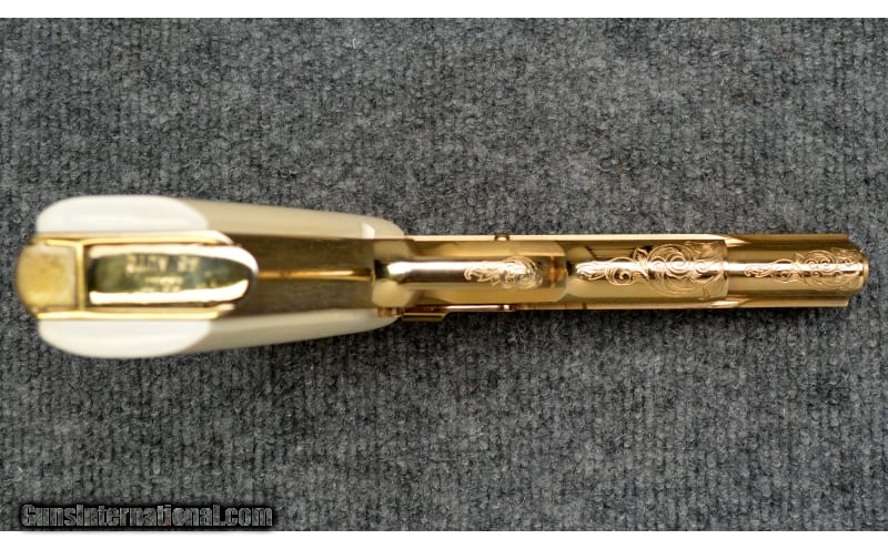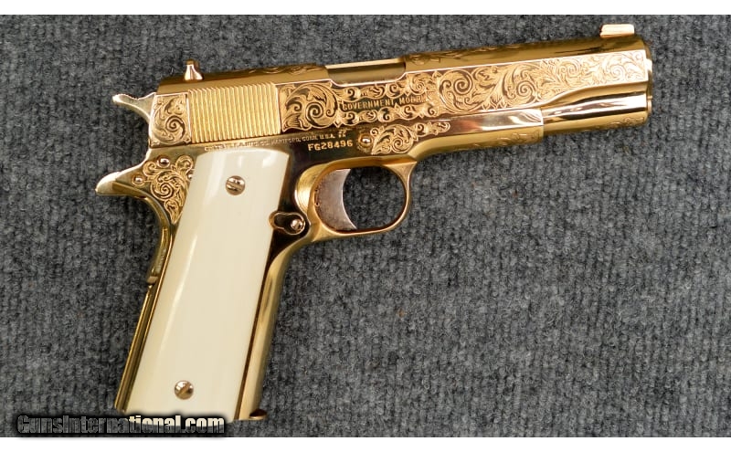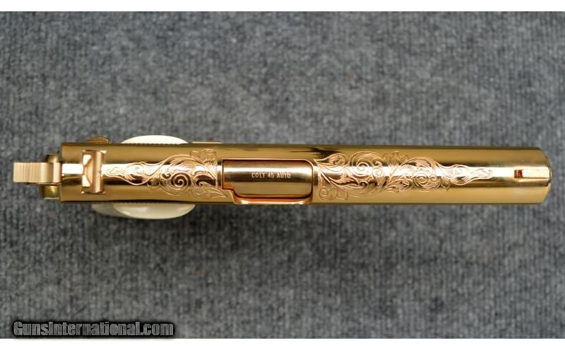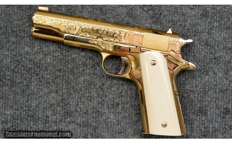 Description: For your consideration, a Colt Government Mk IV Series 70 chambered in .45 ACP. This piece has been coverage engraved with scroll work and gilded. Piece dates to 1984. .45 Auto SOLD Metal Condition: Excellent Wood Condition: Excellent Bore Condition: Excellent Barrels: 5 Triggers: Serrated Face Weight: 2.5 lbs Sights: Iron Sights Item Location: Hamburg, PA |