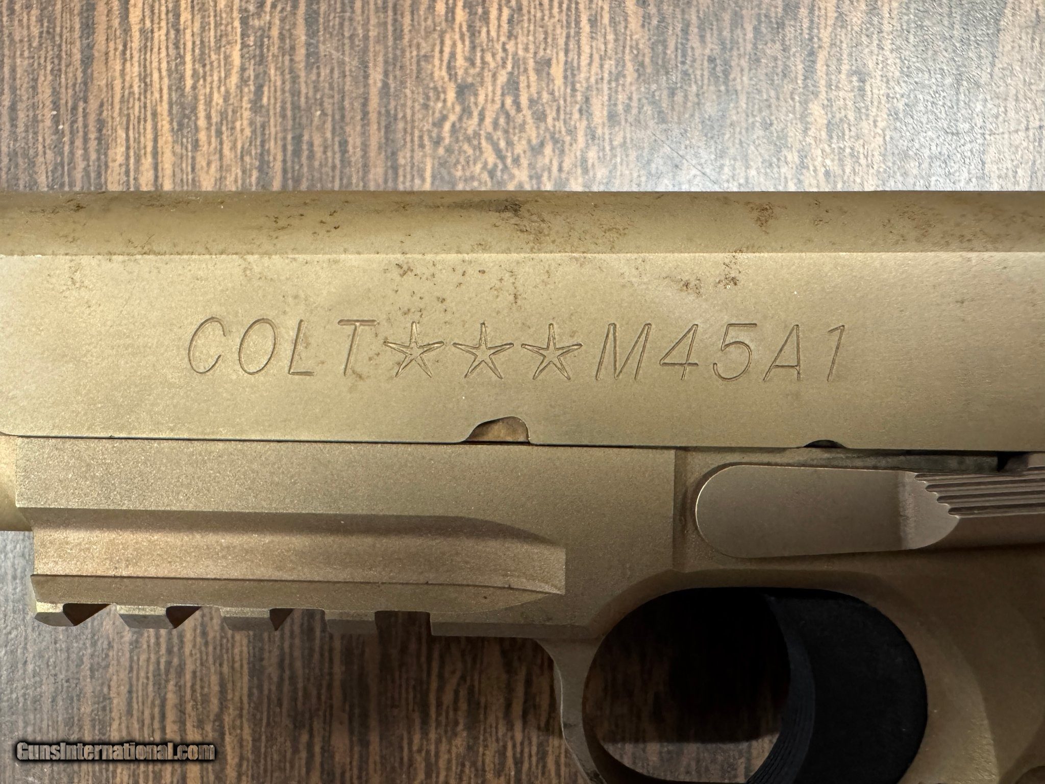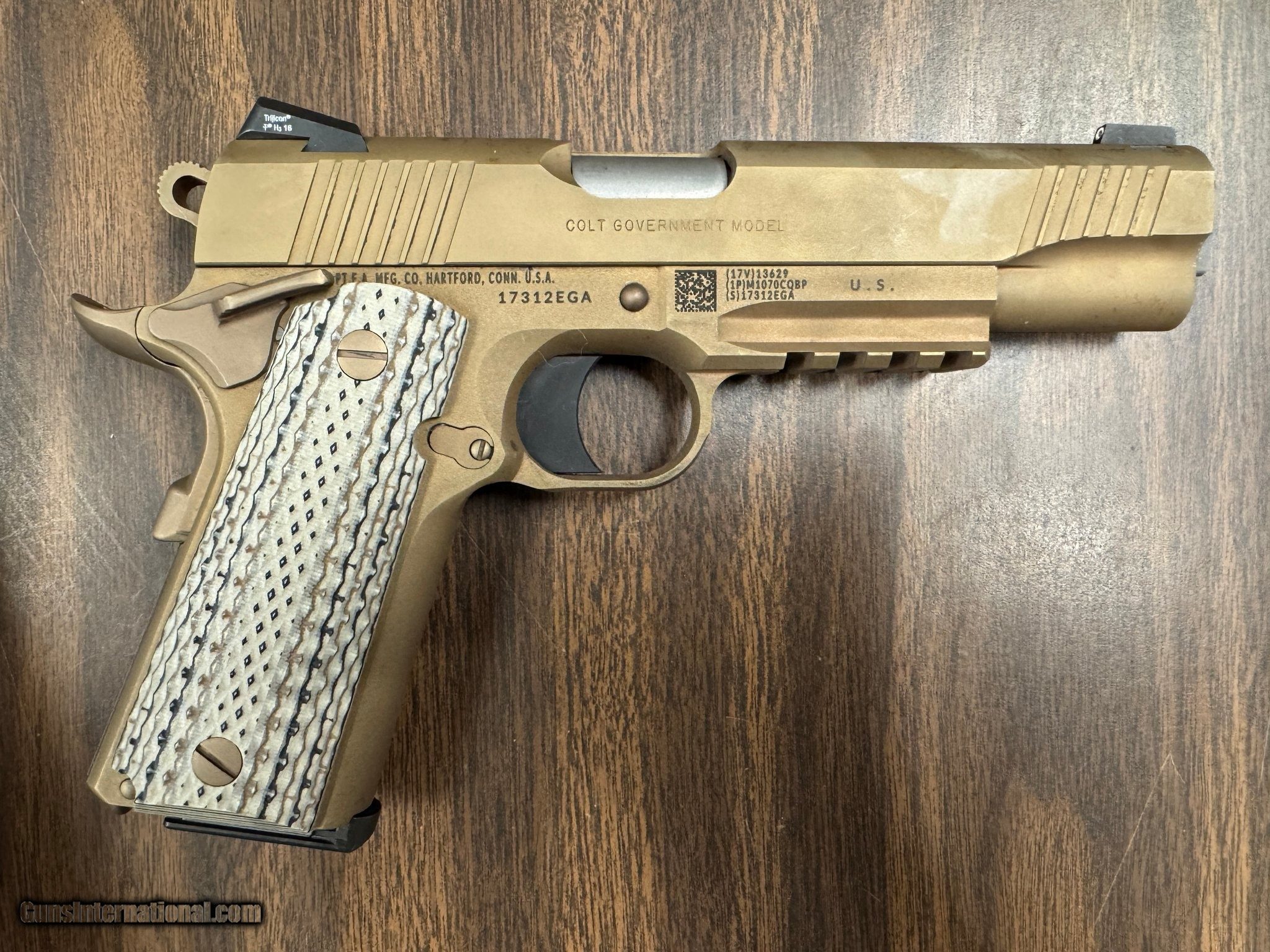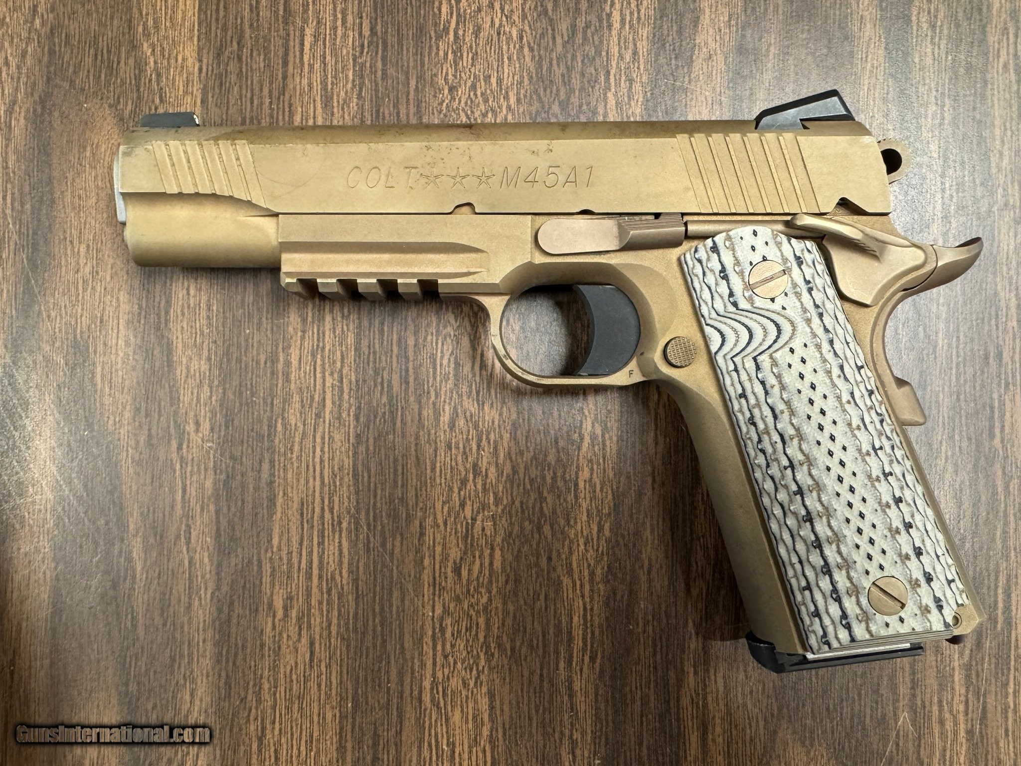 Description: Guns Listing ID: 556156 Colt‚s Manufacturing, M45A1 Marine Pistol, Series 80, Semi-automatic Pistol, 45 ACP, 5\" Barrel, Steel Frame, Zinc Brown Ion Bond Finish, G10 Grips, 8Rd, Novak Carry Night Sights w/Dots -Firearm is in okay condition -2x Mags, Original Hardcase -45 ACP -Slide Finish has imperfections SOLD Manufacturer: COLT Model: M45A1 CQBP MARINE Caliber Info: .45 ACP Condition: Used - Non-Certified Barrels: 5 BARREL Action: SEMI AUTOMATIC Finish: CERAKOTE FDE |