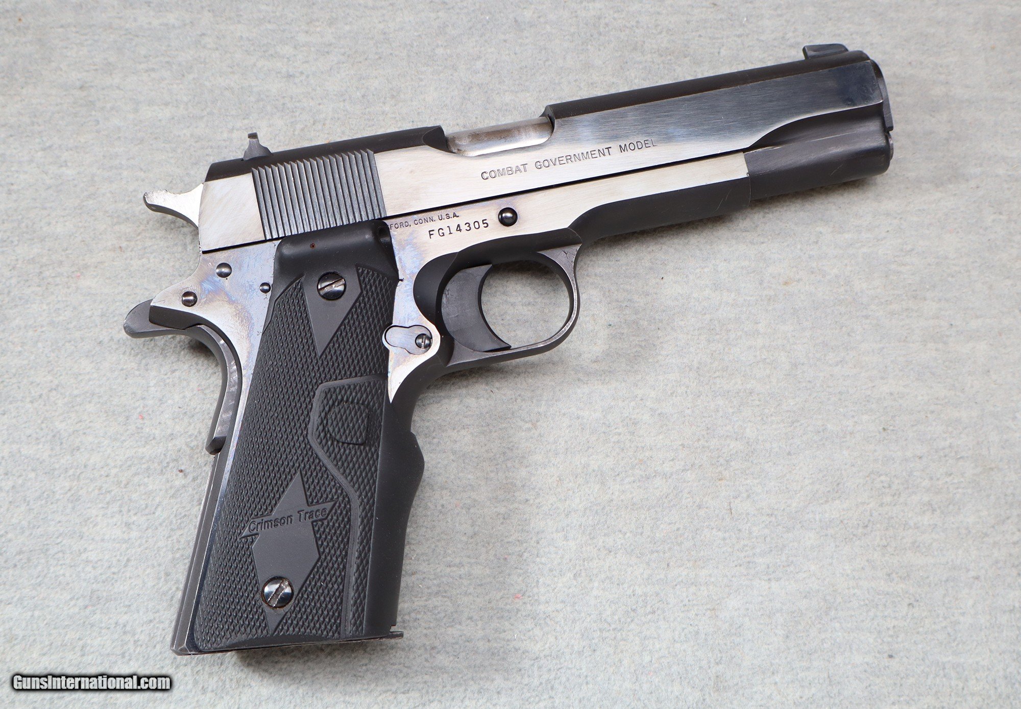 Description: Colt MK IV Series 80 Combat Government Model .45 Auto that comes with three magazines. Equipped with Crimson Trace laser grips. Classic Colt 1911 that shows normal wear. .45 Auto SOLD Metal Condition: good Bore Condition: bright Barrels: 5" barrel Butt Pad: Crimson Trace laser grips Weight: 2 lbs 4 oz Sights: factory sights Item Location: La Vista, NE |