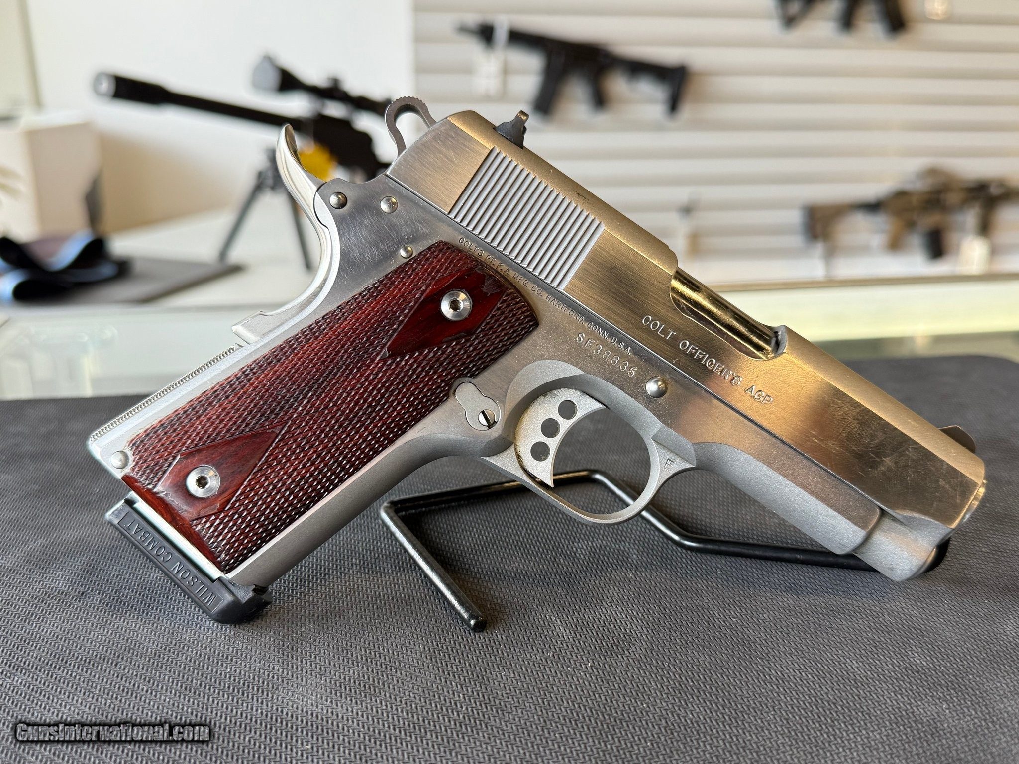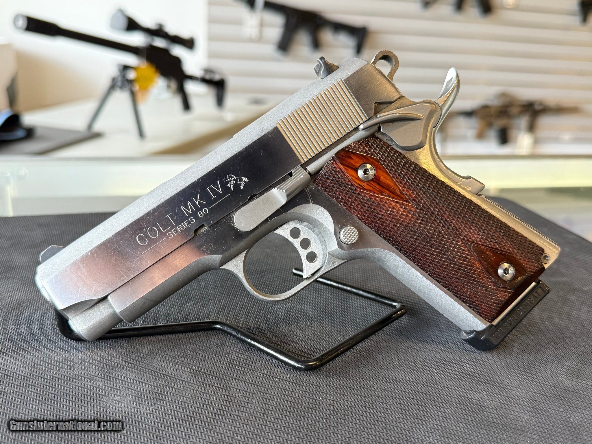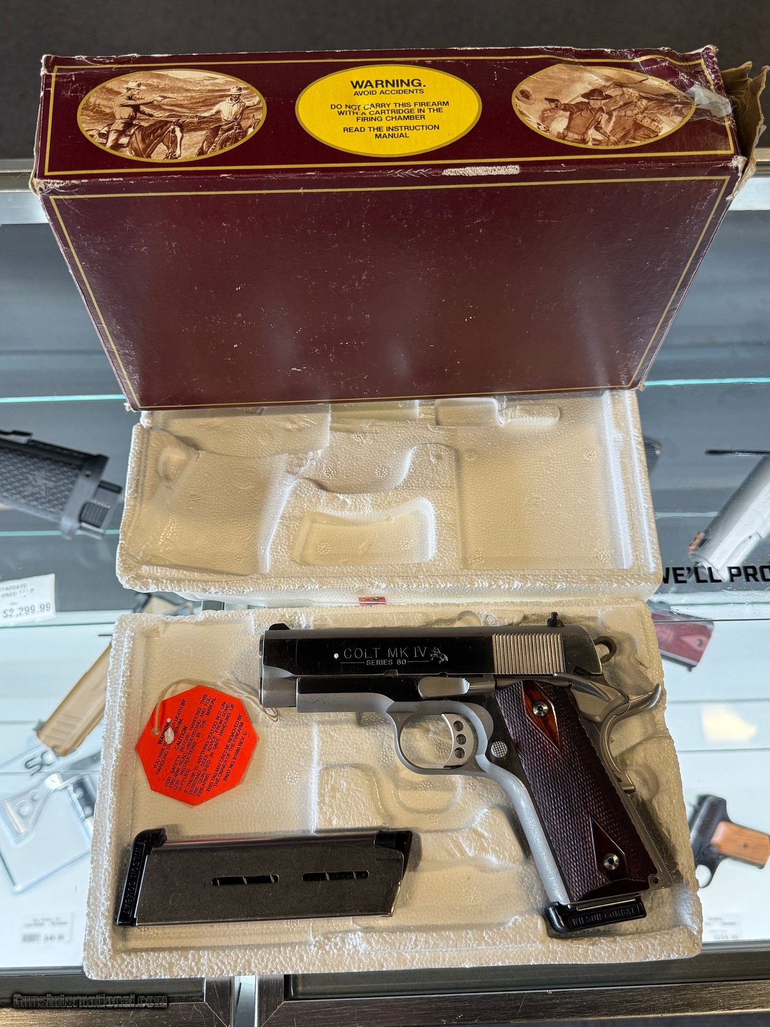 Description: Guns Listing ID: 549410 - GOOD CONDITION - ORIGINAL BOX - TWO MAGAZINES SOLD Manufacturer: COLT Model: MK IV SERIES 80 OFFICERS Caliber Info: .45 ACP Condition: Used - Non-Certified Barrels: 3.5 BARREL Action: SEMI AUTOMATIC Finish: stainless/wood grips |