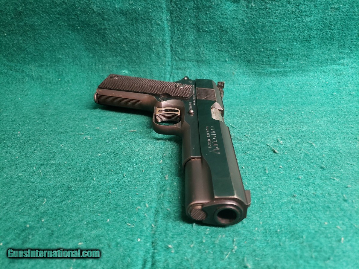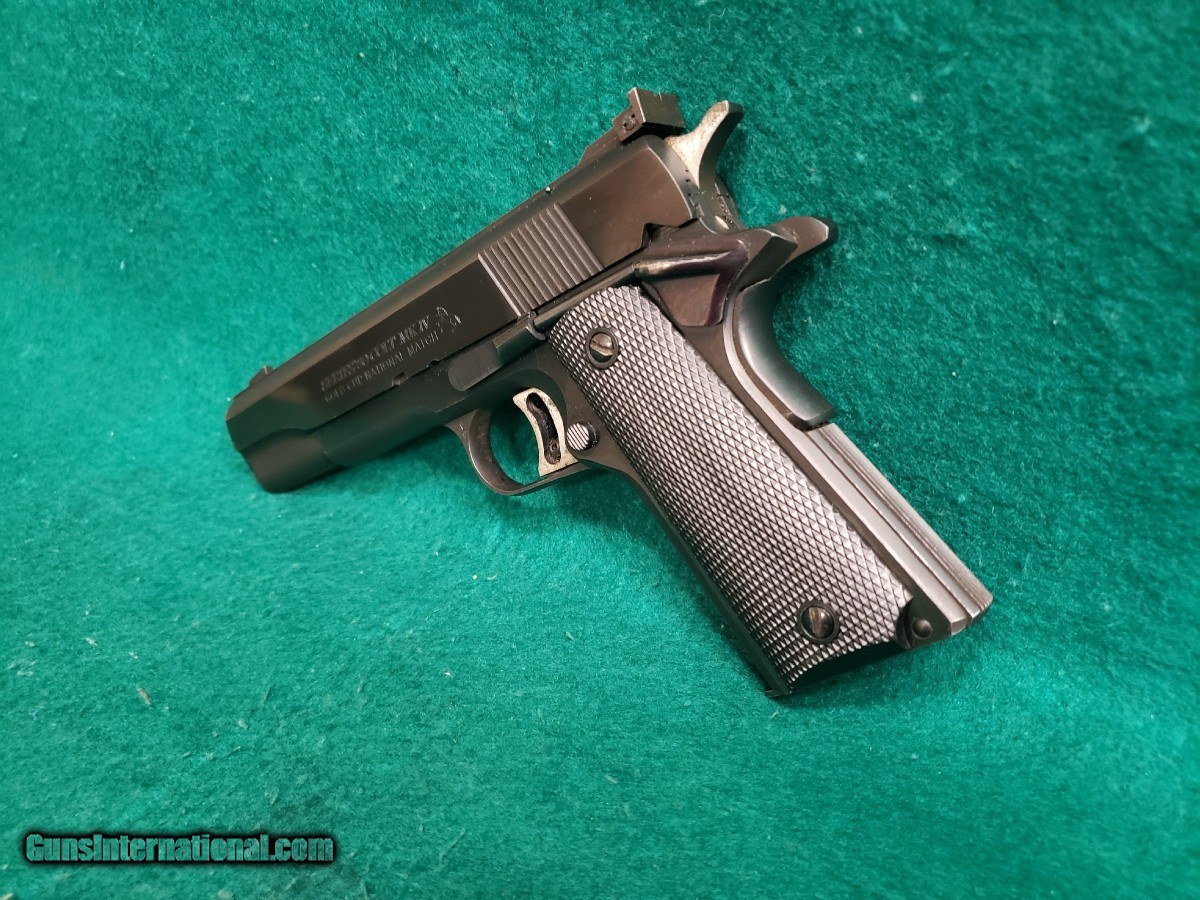 Description: Here is a real beauty! This is a Colt Government Model 1911 Series 80 MK IV Gold Cup National Match chambered in .45 ACP. This gorgeous pistol was built in 1983 and is the top of the line version of Colt's 1911. Has a 5 inch barrel with a minty looking bore that has crisp sharp rifling. This pistol is in excellent condition and works great! The original blued finish is 90% or better with only some faint thinning and scratches. Has a very faint idiot scratch under the slide stop. Has the Gold Cup only solid rib target slide with adjustable target "Elliason" sights. Serrated front strap. national match trigger. This Colt has great barrel lockup and a tight fit bushing. The trigger is nice and crisp as you would expect from a Gold Cup. Comes with one oem Colt magazine. Overall this is just a fantastic pistol that would make an excellent competition 1911 or just as part of a collection. See our pictures of this beauty and if you have any questions please call Justin or Ben at Olde West (530)243-8334. Buyer will pay actual shipping cost insured within the USA. NOTE: THIS PISTOL IS NOT LEGAL FOR SALE TO RESIDENTS OF CALIFORNIA SO PLEASE DO NOTIF YOU LIVE THERE -There Will Be a 3% Processing Fee Applied to all Credit Card Transactions -California Residents Will be Required to Pay Sales Tax of 7.25% -All Firearms Shipped and Insured Within the USA. Shipping Fees Calculated to Lower 48 States. Alaska and Hawaii May Cost Extra -Handguns Ship USPS Priority and Long Guns Ship UPS Ground Unless Otherwise Requested -Shipping Can be Combined to Save You Money if You Purchase Multiple Guns of the Same Type (E.G. Pistols or Long Guns) -Please Message me for a Shipping Quote if the Listing Does not Specify a Rate -Many Handguns are Not Legal for Sale in California. Please Check the Item Description and California DOJ Handgun Roster -C&R Eligible Firearms May not be Shipped to C&R Holders Within California. They Must be Shipped to an FFL Dealer and Picked Up From There. We can Ship Directly to C&R Holders in all Other States -We do Require Photo Identification Proving That you are at Least 21 Years of age for Antique Firearms to be Shipped Direct. We Also Require a Statement That you May Legally own Firearms -Please Check Your Local and State Laws Regarding Firearms and Magazine Restrictions Before Buying SOLD Manufacturer: COLT Model: 1911 GOVERNMENT - GOLD CUP NATIONAL MATCH MK IV SERIES 80 Serial Number: FN03103 Caliber Info: .45 ACP Condition: EXCELLENT WITH ONLY FAINT THINNING AND SCRATCHES Metal Condition: EXCELLENT Bore Condition: MINTY WITH SHARP CRISP RIFLING Barrels: 5 INCH Action: SEMI-AUTO Finish: ORIGINAL BLUED - 90% OR BETTER Sights: FACTORY ADJUSTABLE Manufacture Date: 1983 |