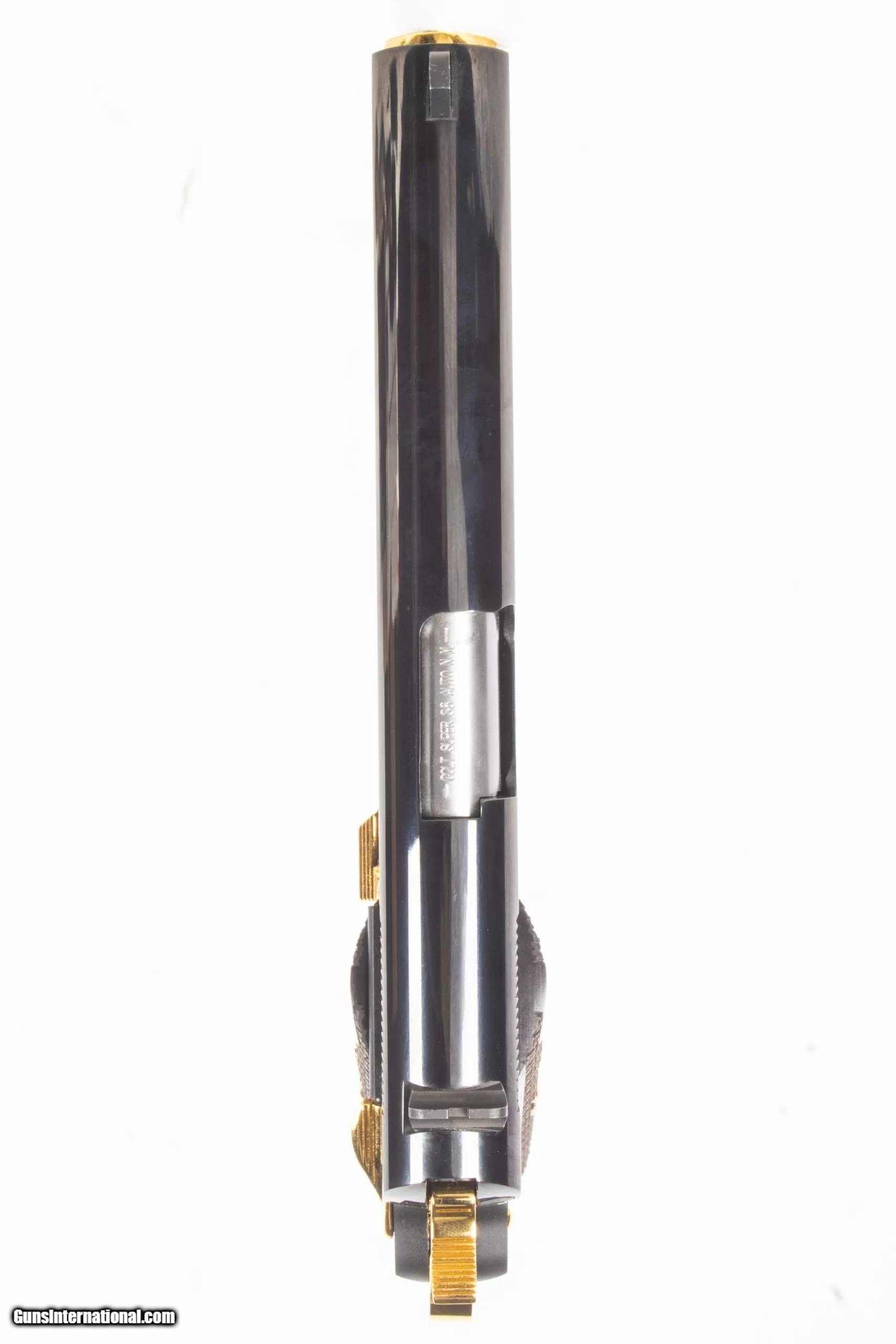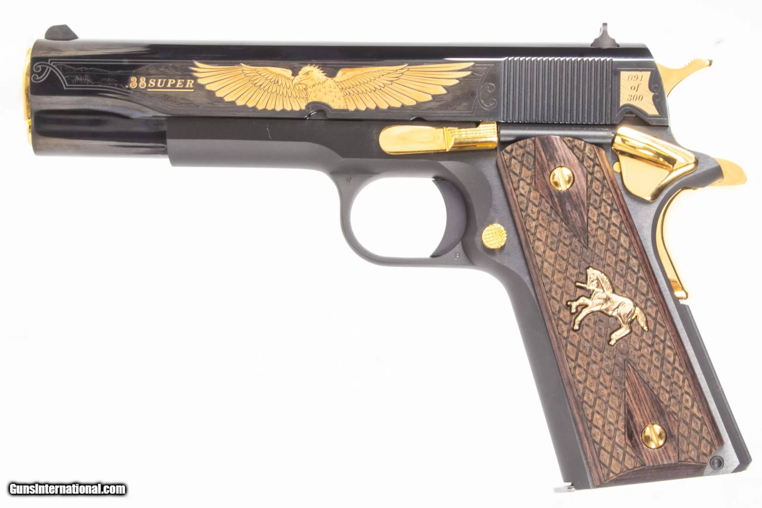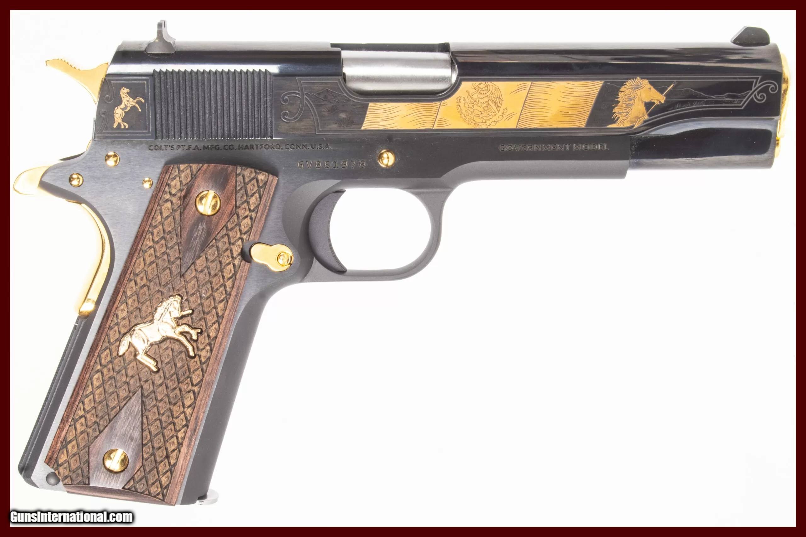 Description: Colt 1911 Government Model, 91/300 'El Orgullo de Mexico' edition chambered for .38 Super - Government profile with five-inch barrel, blued with engraved slide, gold inlay/detail, and double-diamond checkered wood grips with gold Colt ponies. The NRA grading condition for this firearm is NEW. We ship domestically in the United States. Additional shipping rates apply to Alaska and Hawaii. Dury’s Lifetime Warranty: All firearms purchased from Dury’s Gun Shop, NEW or USED, are covered by a lifetime warranty. We will repair or replace, at our discretion, any firearm purchased from Dury’s Gun Shop, Inc. for as long as it is owned by the purchaser. This warranty is not transferable. WE BUY GUNS! NO COLLECTION TOO BIG OR SMALL FOR OUR GUNS INTERNATIONAL CUSTOMERS ALL OF OUR FIREARMS CAN BE PURCHASED DIRECTLY FROM OUR DURY’S GUNS SITE ! SOLD Manufacturer: Colt Model: Government Model Caliber Info: 38 Super Automatic Barrels: 5inches |
