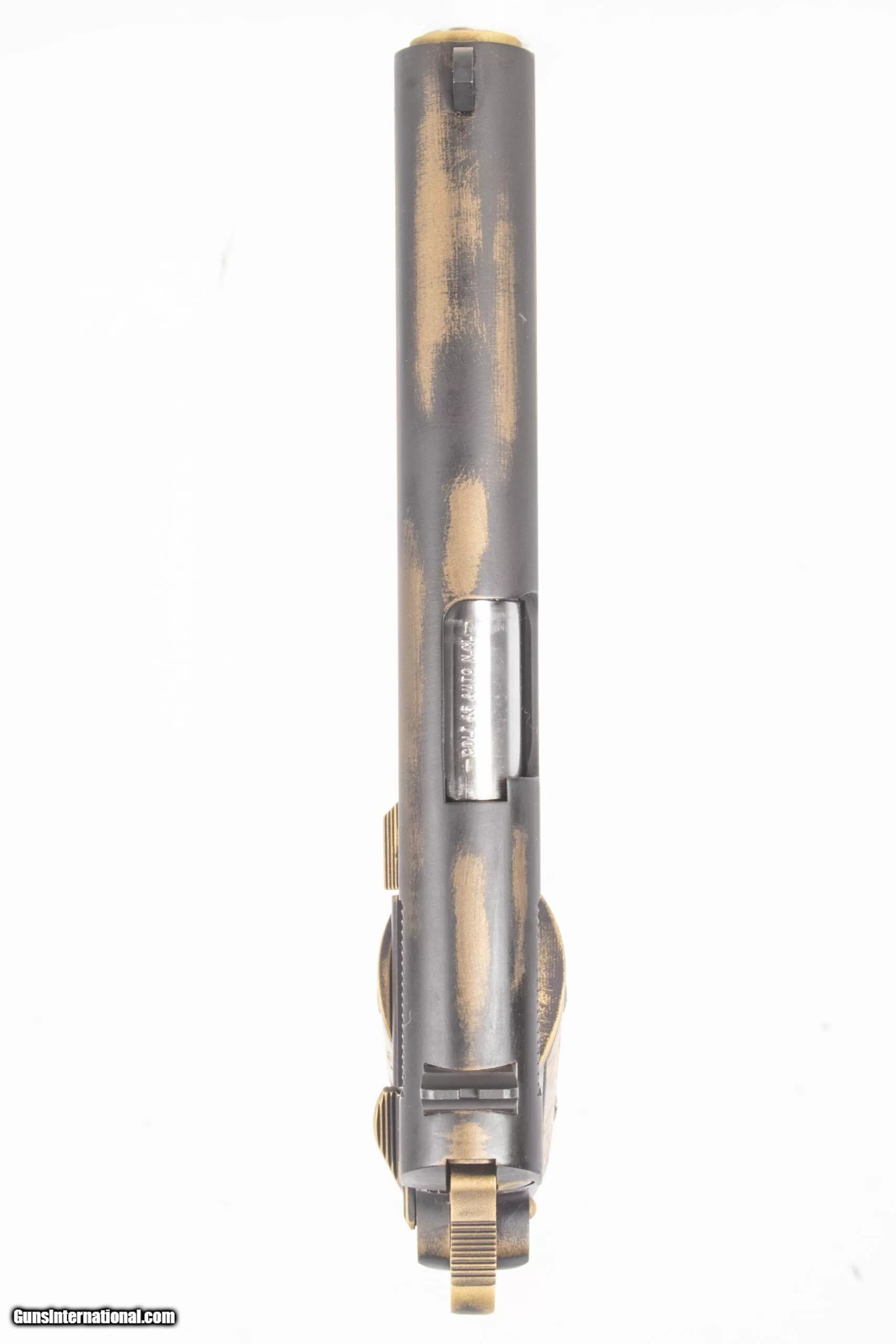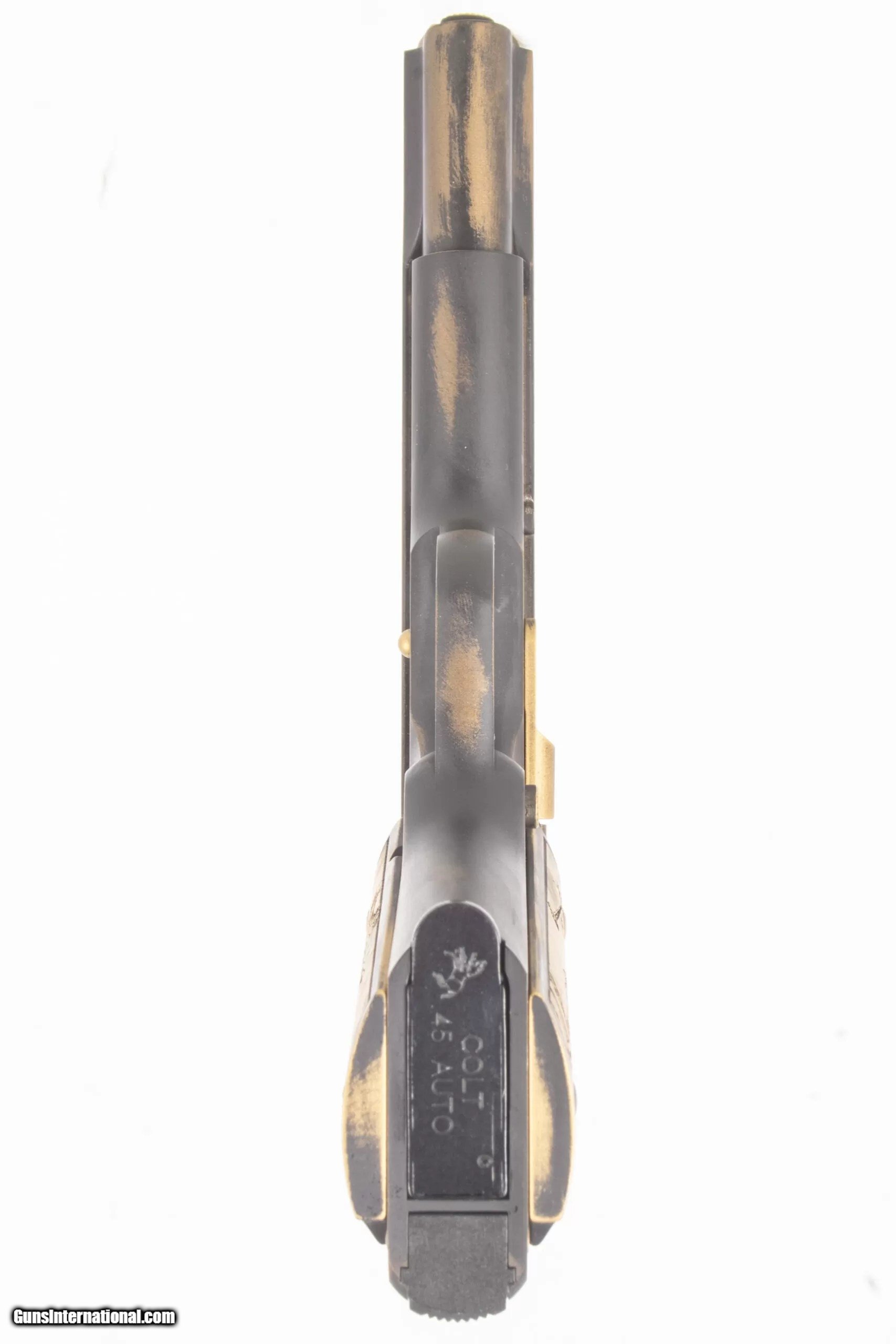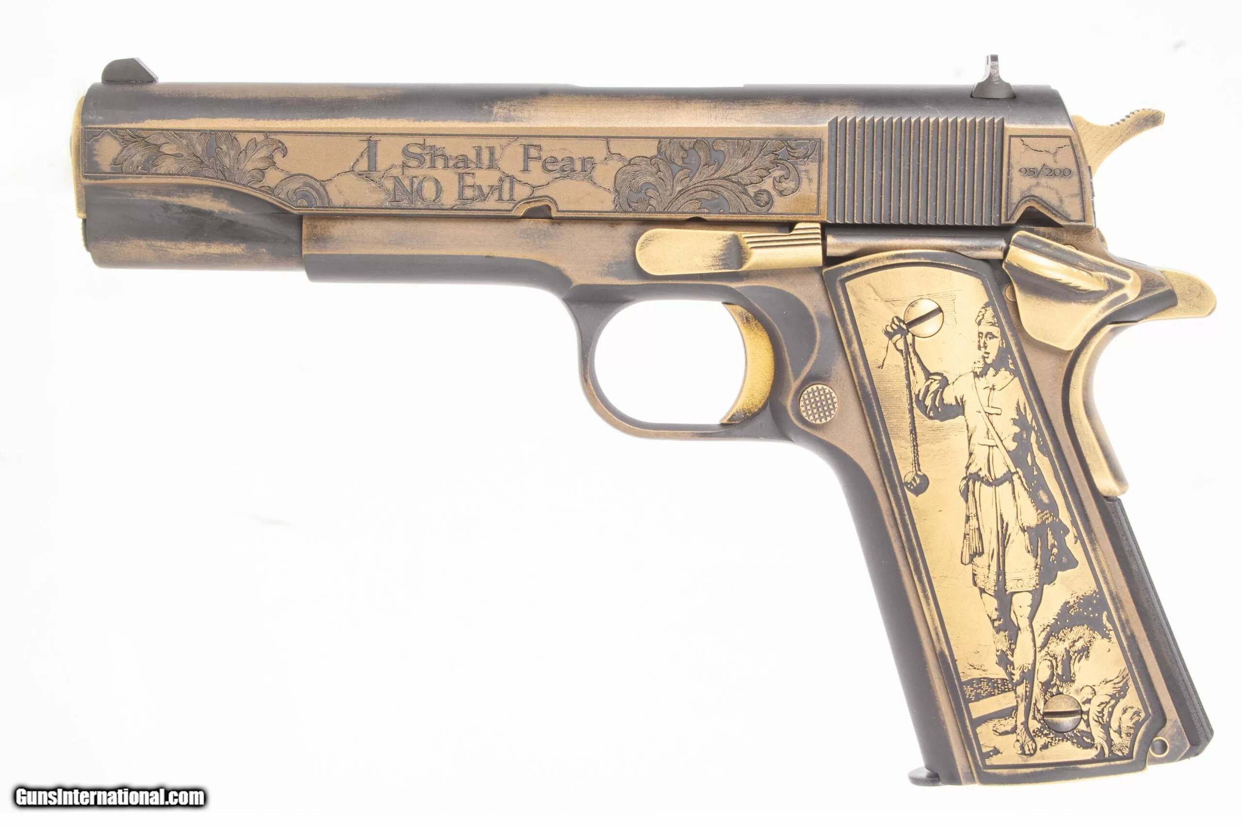 Description: Colt Government Model 1911 chambered for .45 ACP- 95/200 David and Goliath edition - Governmetn profile with five-inch barrel, battle-worn bronze with flourish and biblical engraving with matching grip engravings and color. The NRA grading condition for this firearm is NEW. We ship domestically in the United States. Additional shipping rates apply to Alaska and Hawaii. Dury’s Lifetime Warranty: All firearms purchased from Dury’s Gun Shop, NEW or USED, are covered by a lifetime warranty. We will repair or replace, at our discretion, any firearm purchased from Dury’s Gun Shop, Inc. for as long as it is owned by the purchaser. This warranty is not transferable. WE BUY GUNS! NO COLLECTION TOO BIG OR SMALL FOR OUR GUNS INTERNATIONAL CUSTOMERS ALL OF OUR FIREARMS CAN BE PURCHASED DIRECTLY FROM OUR DURY’S GUNS SITE ! SOLD Manufacturer: Colt Model: 1911 Government Model Caliber Info: 45 ACP Barrels: 5inches |