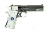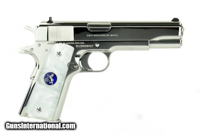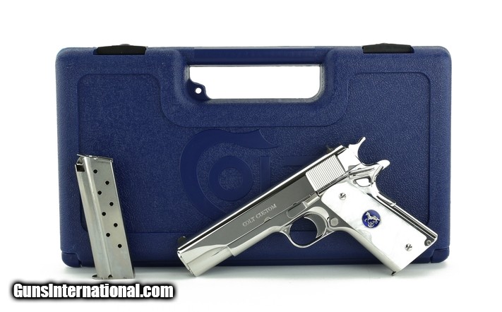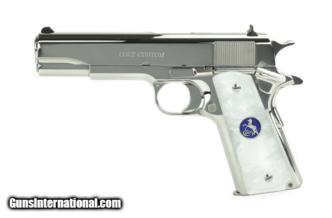 Description: Colt Custom Government .38 Super caliber pistol. Custom Shop model with bright stainless finish and fancy grips. New.