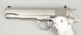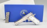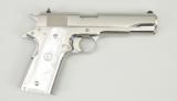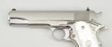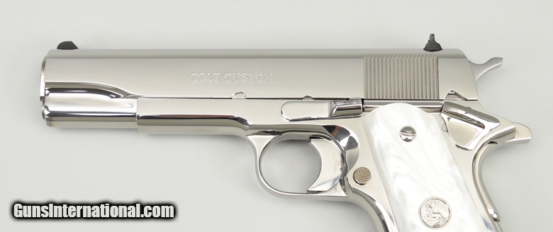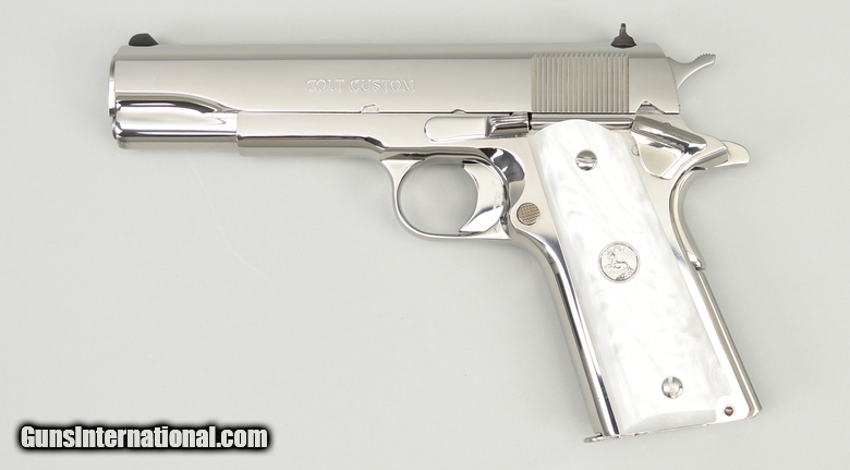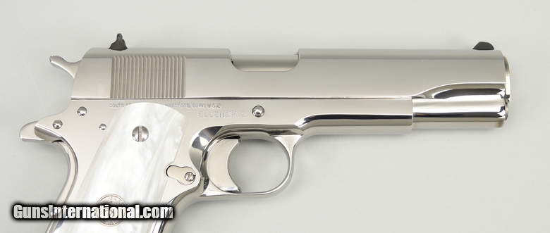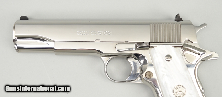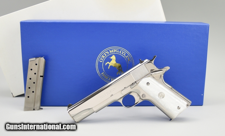 Colt Government .38 Super caliber pistol. Bright stainless custom shop model with fancy grips. Excellent condition with box and magazine.