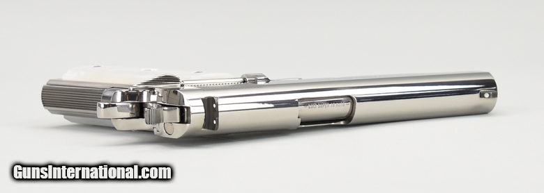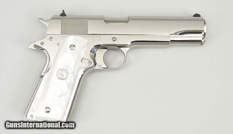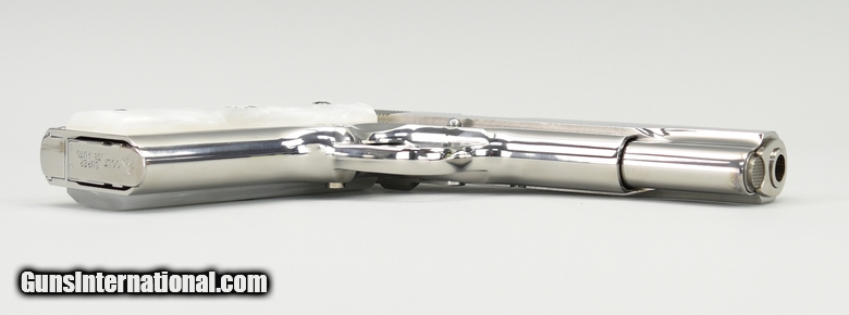 Description: Colt Government .38 Super caliber pistol. Bright stainless custom shop model with fancy grips. Excellent condition with box and magazine. SOLD |