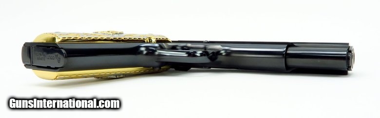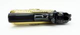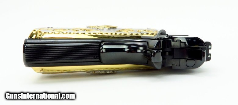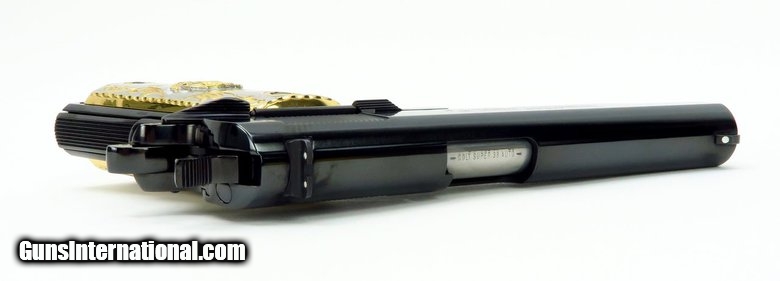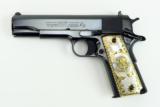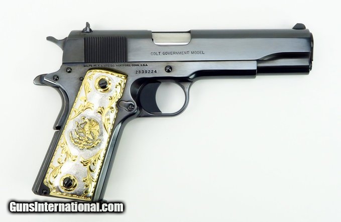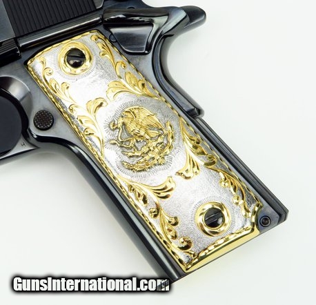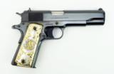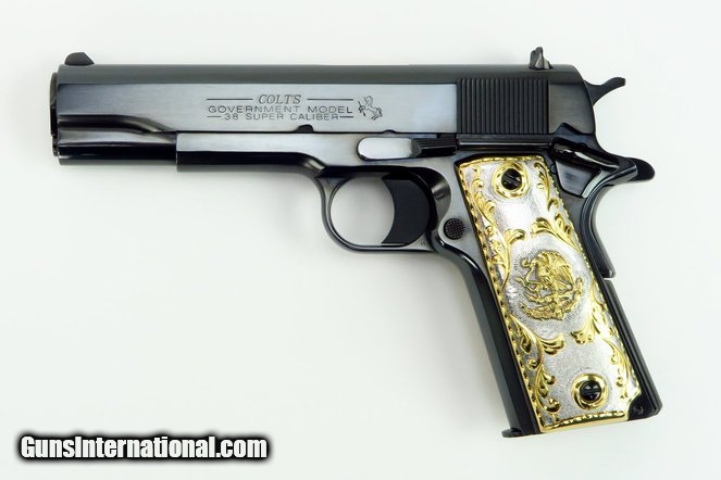Description: Colt Government .38 Super caliber pistol. Customized with polished blue finish and Mexican style silver and gold plated grips. New