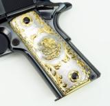 Colt Government .38 Super caliber pistol. Customized with polished blue finish and Mexican style silver and gold plated grips. New