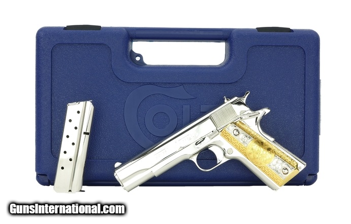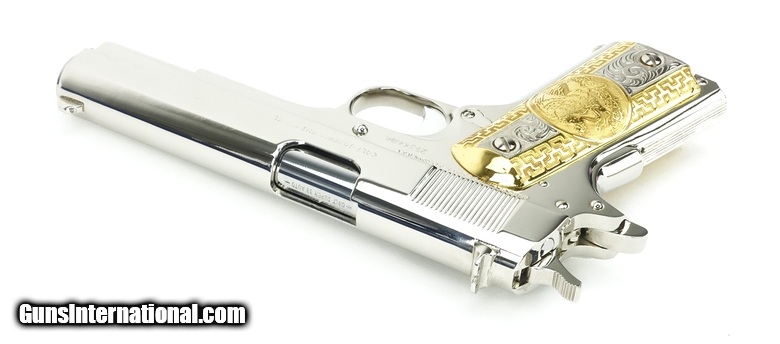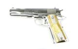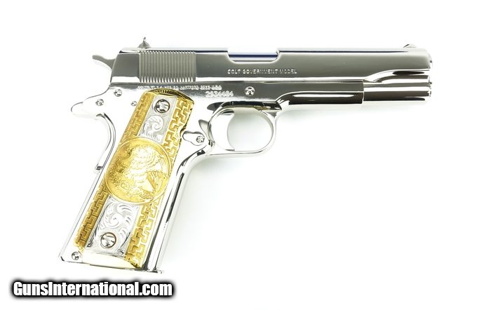 Description: Colt Government .38 Super Caliber Pistol. Customized with bright nickel finish and fancy Mexican style grips. New