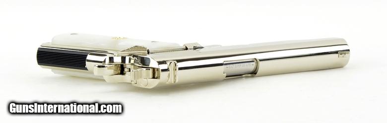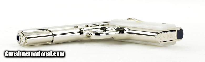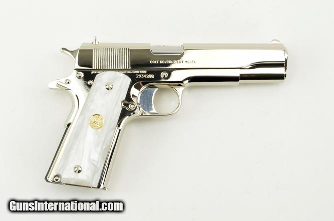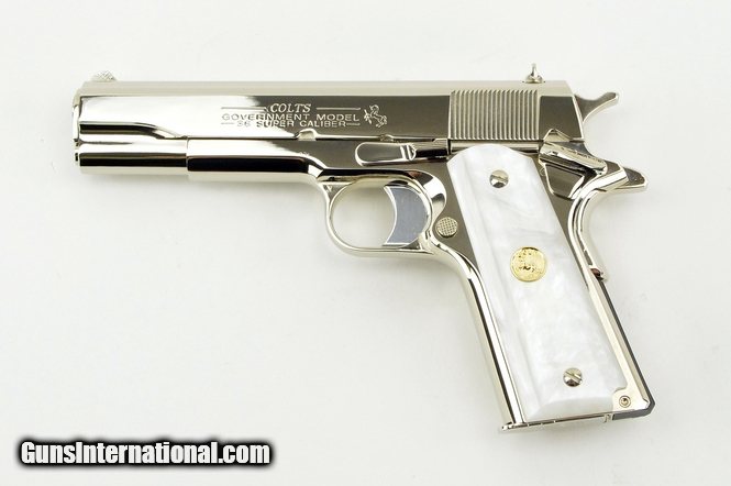 Description: Colt Government .38 Super caliber pistol. Customized with bright nickel finish and fancy grips. New.