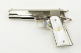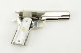 Colt Government .38 Super caliber pistol. Customized with bright nickel finish and fancy grips. New.