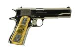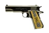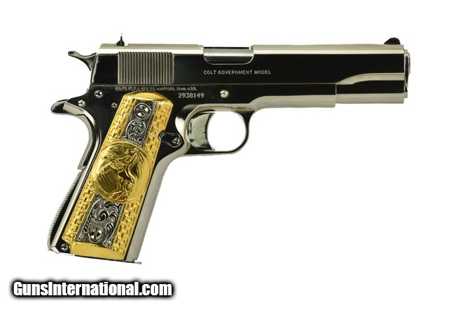 Colt Government .38 Super caliber pistol. New. Customized with bright nickel finish and Mexican grips.