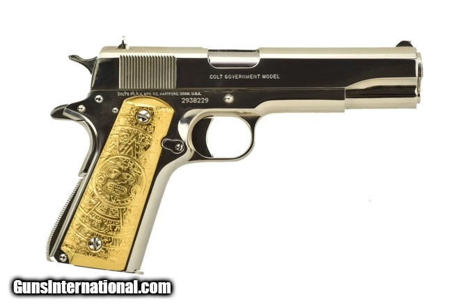 Description: Colt Government .38 Super caliber pistol. New. Customized with bright nickel finish and Mexican grips. SOLD |
