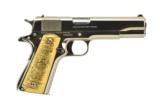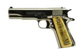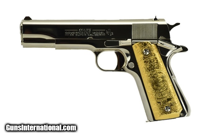 Colt Government .38 Super caliber pistol. New. Customized with bright nickel finish and Mexican grips.