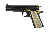 Description: Colt Government .38 Super caliber pistol. Gold Stallion special edition with gold decorations and fancy gold and silver grips. New.