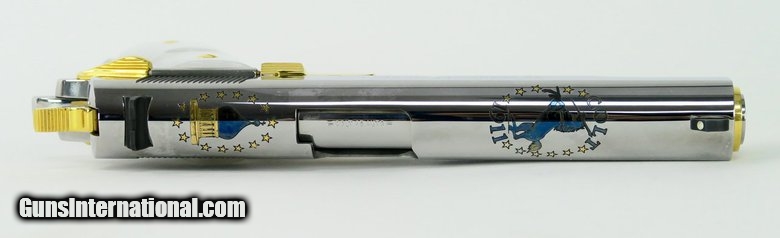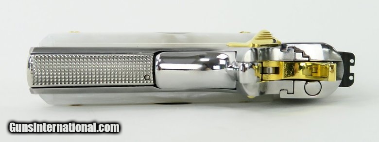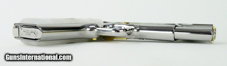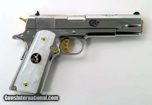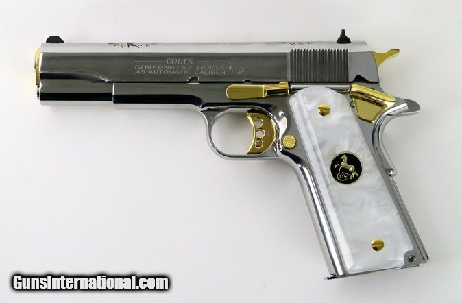 Description: Colt Government .45 ACP caliber pistol. Gold Stallion special model, with good decorations and bright stainless finish. Excellent condition.