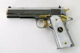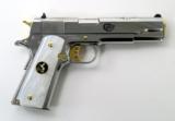 Colt Government .45 ACP caliber pistol. Gold Stallion special model, with good decorations and bright stainless finish. Excellent condition.