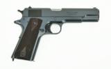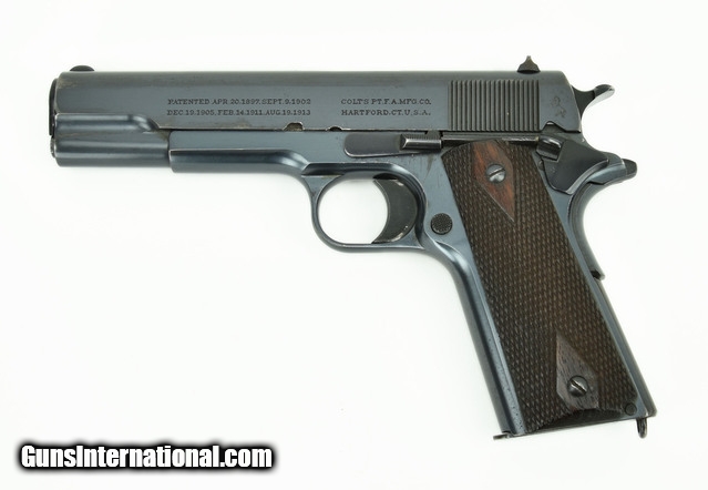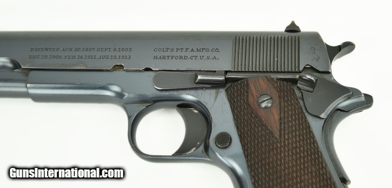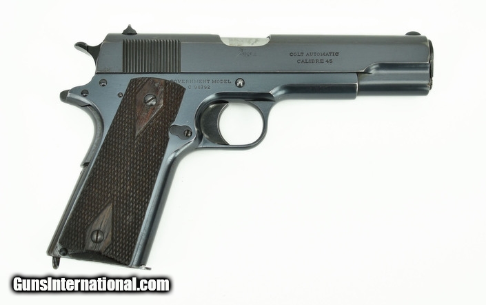 Colt Government .45 ACP caliber pistol. Manufactured approximately 1917. Bore is excellent. Action works perfectly. Grips are excellent. Gun has approximately 95% blue. Very fine 1911 Colt Commercial model.